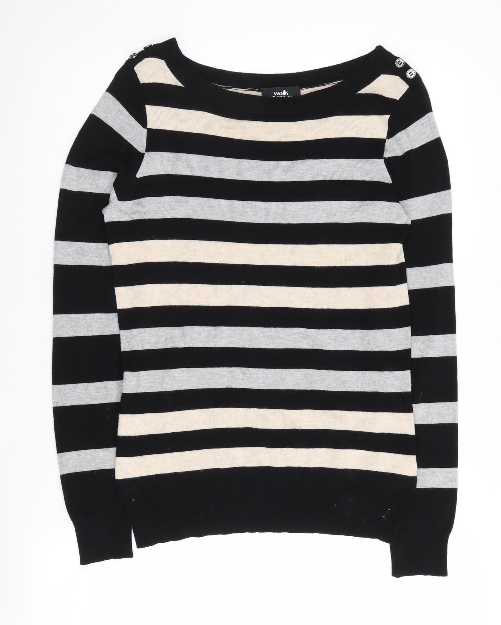 Elevate your wardrobe with this chic Wallis Women's Black Striped Pullover Jumper. Crafted in a regular fit, this jumper is designed for both comfort and style, making it a perfect choice for casual occasions. The classic boat neck complements the elegant striped pattern, creating a versatile look that pairs effortlessly with a variety of outfits. Constructed from a premium blend of 82% viscose, 16% nylon, and 2% elastane, this knit jumper offers both softness and durability. The long sleeves and tight-knit fabric ensure warmth, making it ideal for autumn and winter seasons. Featuring button accents on the shoulders, this jumper adds a subtle touch of sophistication to your ensemble. With a UK size 10 and a timeless black hue, it’s perfect for any fashion-savvy woman looking to add a touch of class to her casual collection. Whether you're running errands or meeting friends for lunch, this Wallis jumper provides all-day comfort and effortless style. Don't miss out on this essential piece for your seasonal wardrobe.