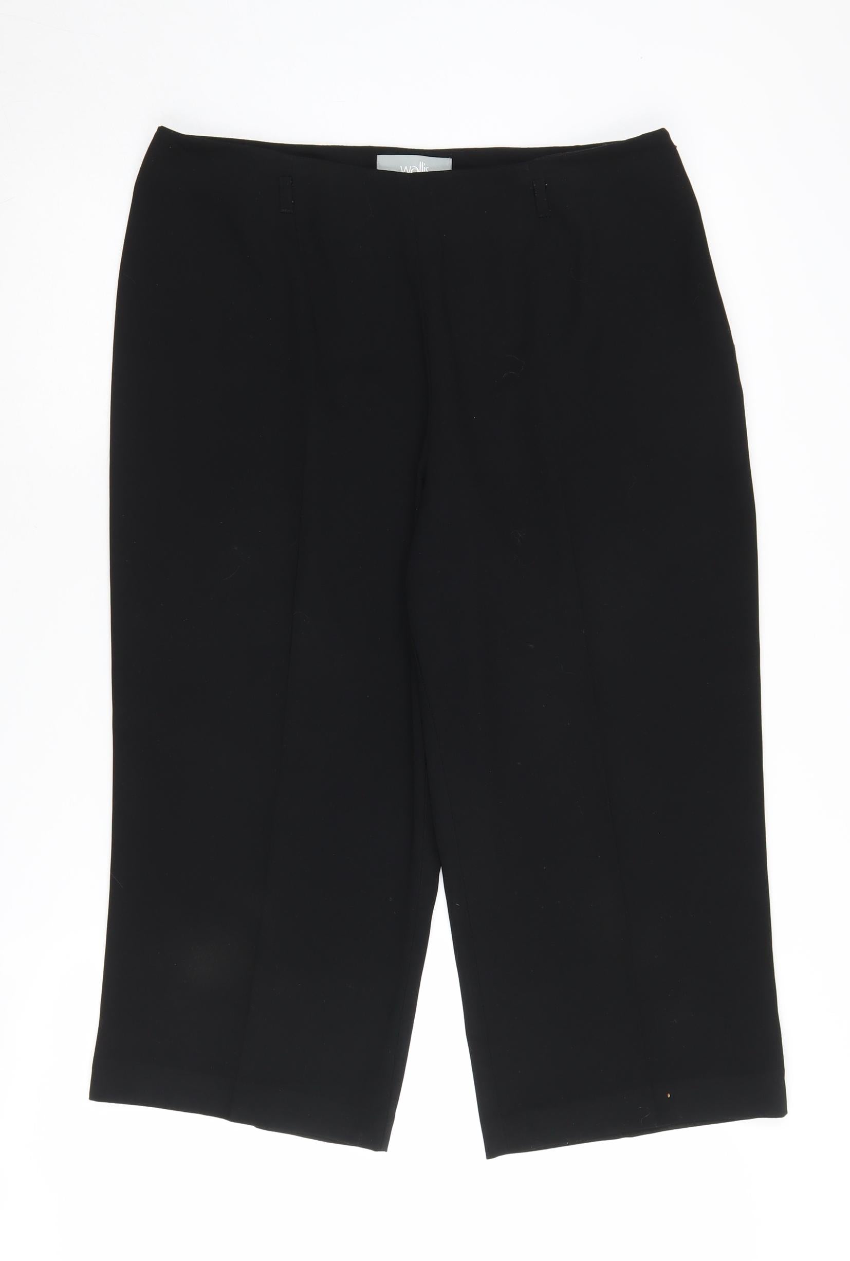 Introducing a sophisticated pair of Wallis trousers, perfect for the modern woman. These classic black trousers come in a UK size 14, offering a flattering fit for a variety of body types. Made from 100% polyester, they provide durability and comfort for everyday wear. The trousers feature a straight leg style and a sleek flat front, making them suitable for both casual and professional settings. Their minimalist design includes no additional patterns, focusing on a timeless look that can be easily matched with various tops and accessories. Whether you're heading to work or attending a casual event, these trousers are a versatile addition to any wardrobe. With their high-quality construction and elegant appearance, you'll find yourself reaching for these trousers time and time again.