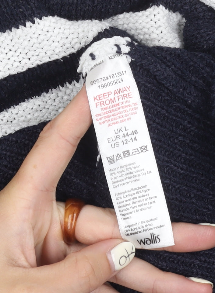 Step out in style with this Wallis women's pullover jumper, designed to add a touch of sophistication to your casual wardrobe. This vibrant multicoloured jumper, featuring an elegant striped pattern, is perfect for those who love to make a statement without compromising on comfort. Crafted from a soft and durable acrylic-nylon blend, this lightweight knit provides all-day comfort, making it an ideal choice for casual outings or relaxed workwear.The jumper's design is updated with a chic boat neckline and flattering 3/4 sleeves, accentuated by stylish button details that add a subtle yet eye-catching flair. Its regular fit ensures it drapes beautifully over any body type, offering a relaxed yet tailored look. Whether paired with your favourite jeans or layered over a shirt, this versatile pullover is sure to become a staple in your seasonal wardrobe.Machine washable and easy to care for, this jumper is both practical and stylish, ensuring you look your best with minimal effort. In excellent condition, you can trust the quality and craftsmanship of this piece to stand the test of time. Perfect for those cool autumn afternoons or layering in the winter, this Wallis jumper effortlessly transitions between seasons while keeping you warm and stylish.With its classic striped design and elegant boat neck, this jumper is perfect for casual settings or adding a pop of pattern to your everyday look. Discover the perfect balance of trend and comfort with this must-have pullover from Wallis, designed for women who appreciate timeless style and luxurious comfort in equal measure.
