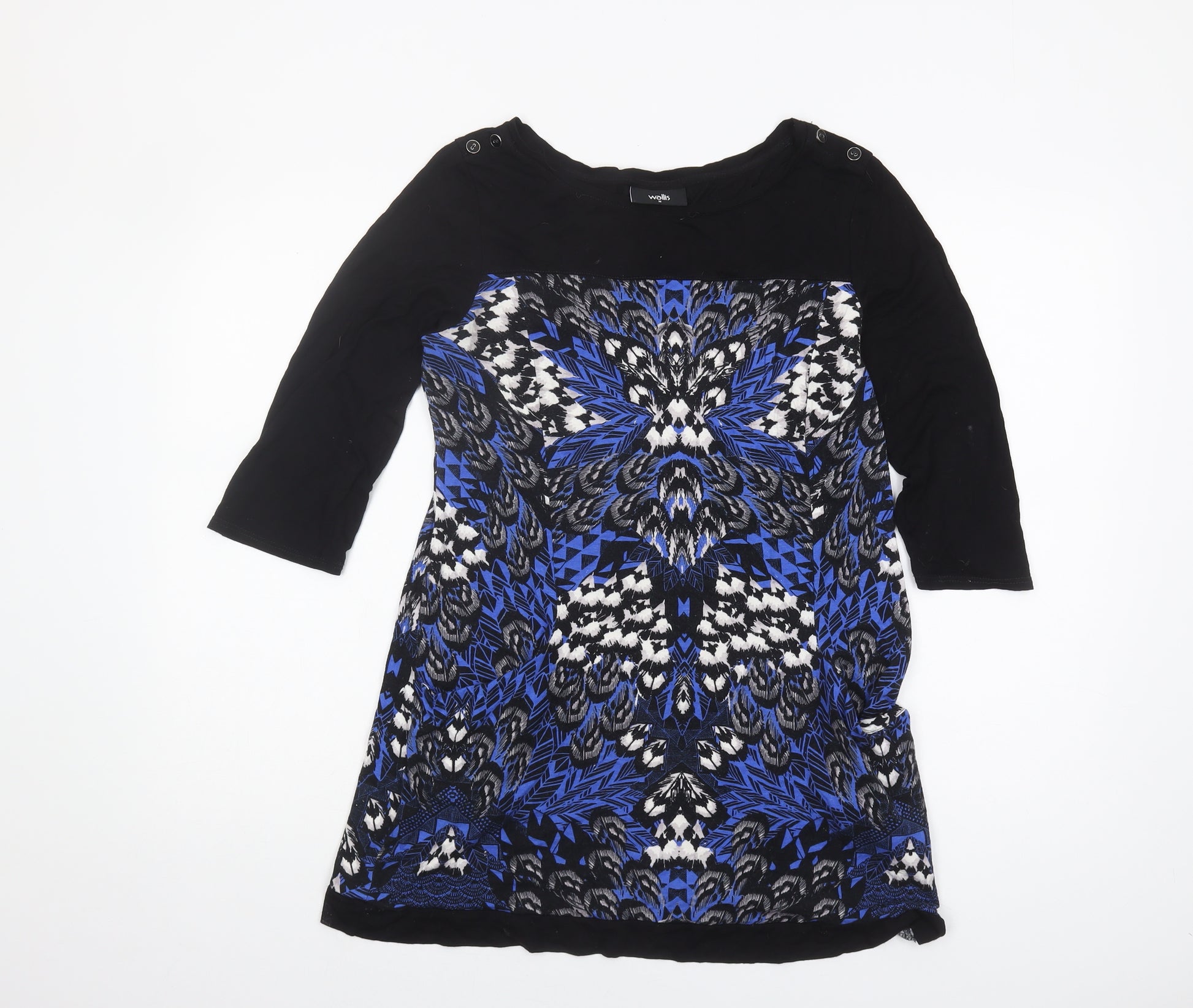Step out in style with this eye-catching multicoloured tunic from Wallis, perfect for any casual occasion. This women's top showcases a bold geometric pattern in blue, black, and white hues, ensuring you turn heads wherever you go. Featuring a flattering boat neck and classic fitted 3/4 length sleeves, this tunic offers a comfortable yet stylish fit for any body type. Made from a high-quality blend of viscose and elastane, the fabric provides a soft touch and stretch for all-day comfort. The jersey material ensures durability while maintaining a chic look. The pullover design and button accents on the shoulders add subtle detailing, making it a versatile piece that's easy to wear. Suitable for multiple seasons, you'll find this tunic a wardrobe staple for spring through autumn. Pair it with your favorite jeans or leggings for an effortlessly stylish look that's perfect for casual outings. Its machine washable nature allows for easy care, making it practical for everyday wear. Whether you're meeting friends or enjoying a relaxed day out, this Wallis tunic is the ideal choice to combine comfort and fashion in one appealing package.