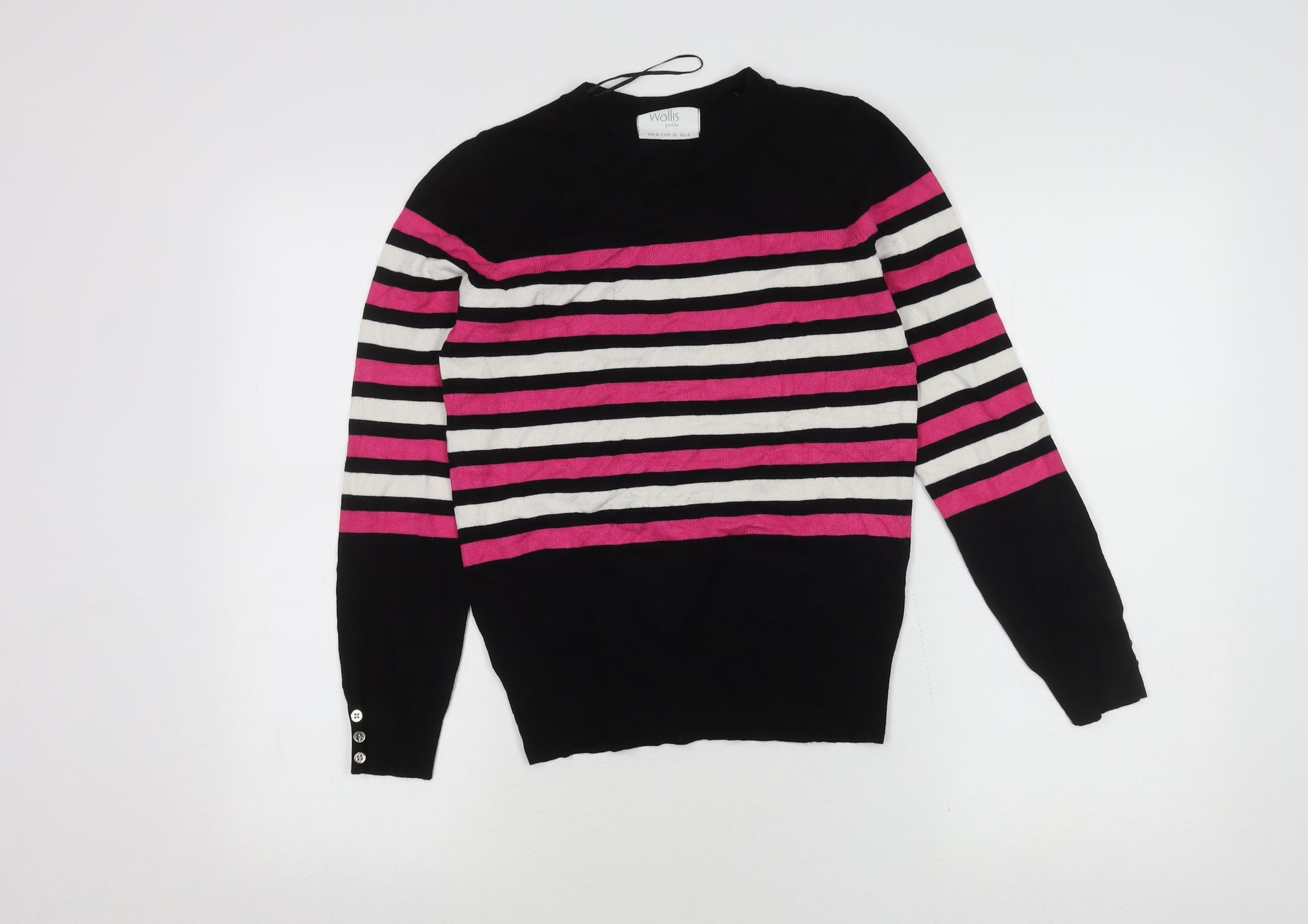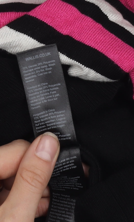 Step out in style with this striking Wallis Women's Pullover Jumper, a perfect blend of comfort and chic. This petite-sized pullover is designed to provide a tailored fit, enhancing your silhouette beautifully. Its multicoloured striped pattern with bold hues of black, pink, and white adds a vibrant touch to your wardrobe and makes a statement wherever it goes. Crafted from a premium fabric blend of 72% Viscose and 28% Polyamide, this jumper offers a soft feel that's gentle on your skin, ensuring all-day comfort. The long sleeves add an element of sophistication, while the button accents on the cuffs give it an elegant edge. Perfect for layering or wearing on its own, this versatile piece is suitable for casual outings and smart settings alike. Despite being pre-loved, it remains in excellent condition with no noticeable imperfections, making it a valuable addition to your wardrobe. Pair it with jeans for a relaxed look or layer over a shirt for a more refined ensemble. This Wallis jumper showcases quality craftsmanship and eye-catching design, ensuring you look fabulous wherever your day takes you.