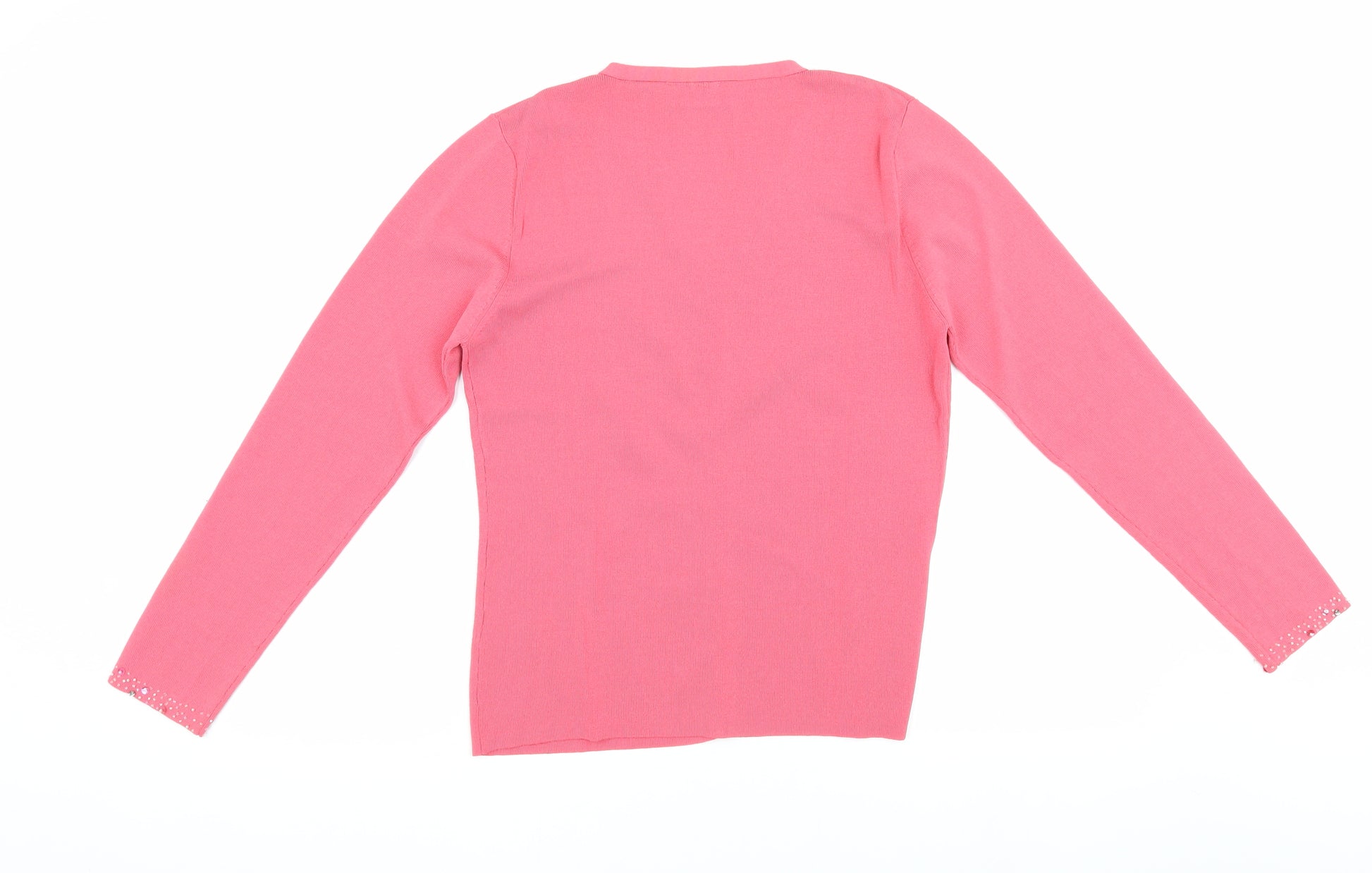 Enhance your wardrobe with this elegant Wallis Women's Pink V-Neck Cardigan, perfect for adding a touch of charm to your outfit. Designed with a regular fit, this piece flatters most body types, making it an essential addition to your casual collection. The cardigan's vibrant pink colour is complemented by sparkling beaded accents and buttons, adding a dash of sophistication to this versatile garment. Crafted from a high-quality viscose and polyamide blend, it offers comfort and durability, suitable for all seasons. Featuring long sleeves and a classic V-neckline, this cardigan can be paired with various outfits, making it ideal for those looking to add a pop of colour to their style. Whether dressing up or down, it's a graceful piece for any occasion. Despite no visible tags, its excellent condition ensures it's a lovely second-hand find, presenting quality at a great value. Embrace this stylish cardigan to enhance your casual wardrobe today.