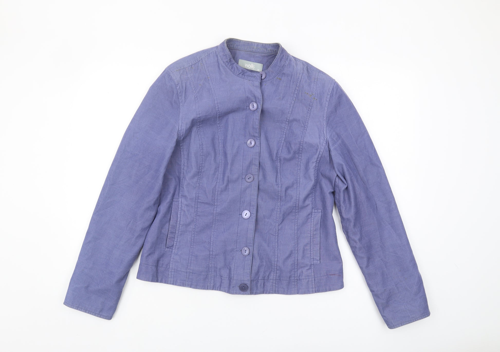 This Wallis jacket, perfect for women who appreciate understated elegance, is an excellent addition to your wardrobe. Crafted from 100% cotton, it offers comfort and breathability, making it ideal for the transitional seasons of spring and autumn. Its lightweight and breathable nature allow for easy layering, providing versatility from casual outings to workwear settings. The jacket features a stylish collarless design with a button closure, ensuring a clean, modern look. The rich purple hue adds a touch of femininity and sophistication, seamlessly blending with a variety of outfits. With long sleeves and a regular, relaxed fit, this short jacket flatters any body shape, offering freedom of movement while maintaining a polished silhouette. Though used, the jacket remains in excellent condition with slight wear visible, ensuring durability and longevity. Machine washable for effortless care, it suits those with a busy lifestyle yet who don't want to compromise on style. Priced reasonably, this jacket provides exceptional value for a piece that can transition seamlessly from season to season and occasion to occasion. This versatile and classic piece from Wallis promises not just comfort but also timeless style.