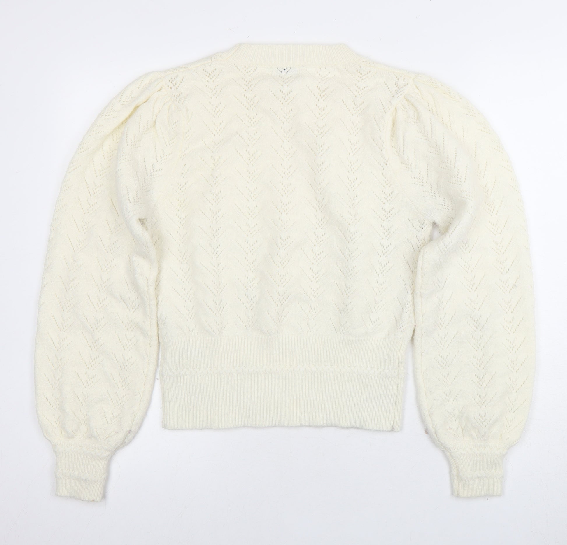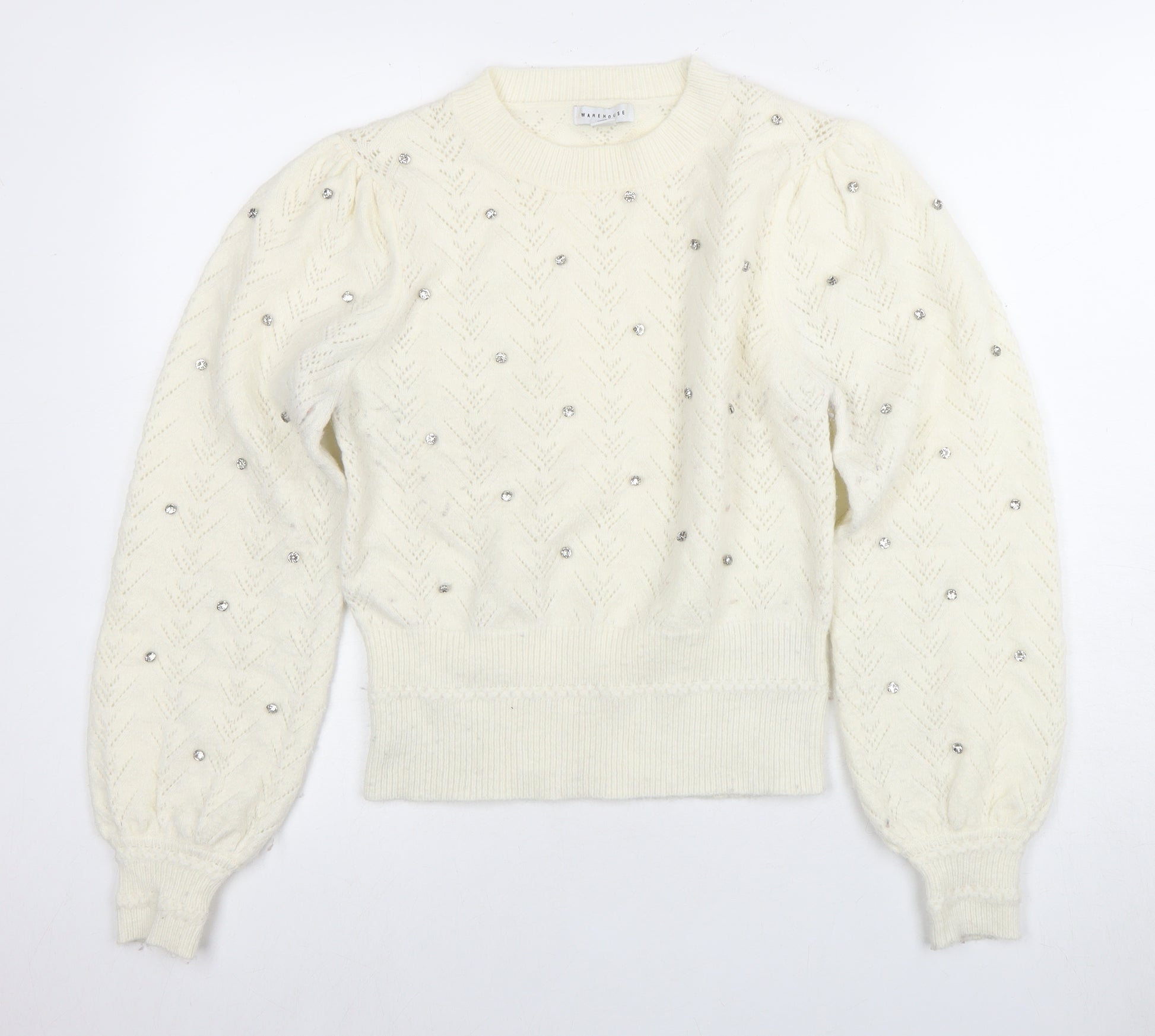 Step into elegance with this stunning Warehouse jumper, a perfect piece for the style-conscious woman. Crafted with meticulous attention to detail, this ivory jumper features a delicate open-knit style, which gives it a sophisticated yet relaxed appearance, making it ideal for both work and casual outings. The addition of sparkling jewel accents enhances its appeal, ensuring you stand out in any crowd. Designed with a crew neck and long balloon sleeves, this knit jumper offers both comfort and versatility. The use of a robust acrylic and polyamide blend ensures durability while maintaining a lightweight feel, making it suitable for the transitional seasons of autumn and winter. The soft ivory colour provides a neutral staple that pairs effortlessly with any outfit. Whether you're heading to the office or enjoying a weekend outing, this jumper is perfect for layering or wearing on its own. Its regular size fit, combined with machine washable care instructions, ensures convenience and ease of wear. Despite its pre-owned status, it remains in excellent condition, with no visible wear or damage. Elevate your wardrobe with this timeless piece and enjoy the seamless blend of style and comfort it offers. Available now in size small, suitable for any modern woman's collection.