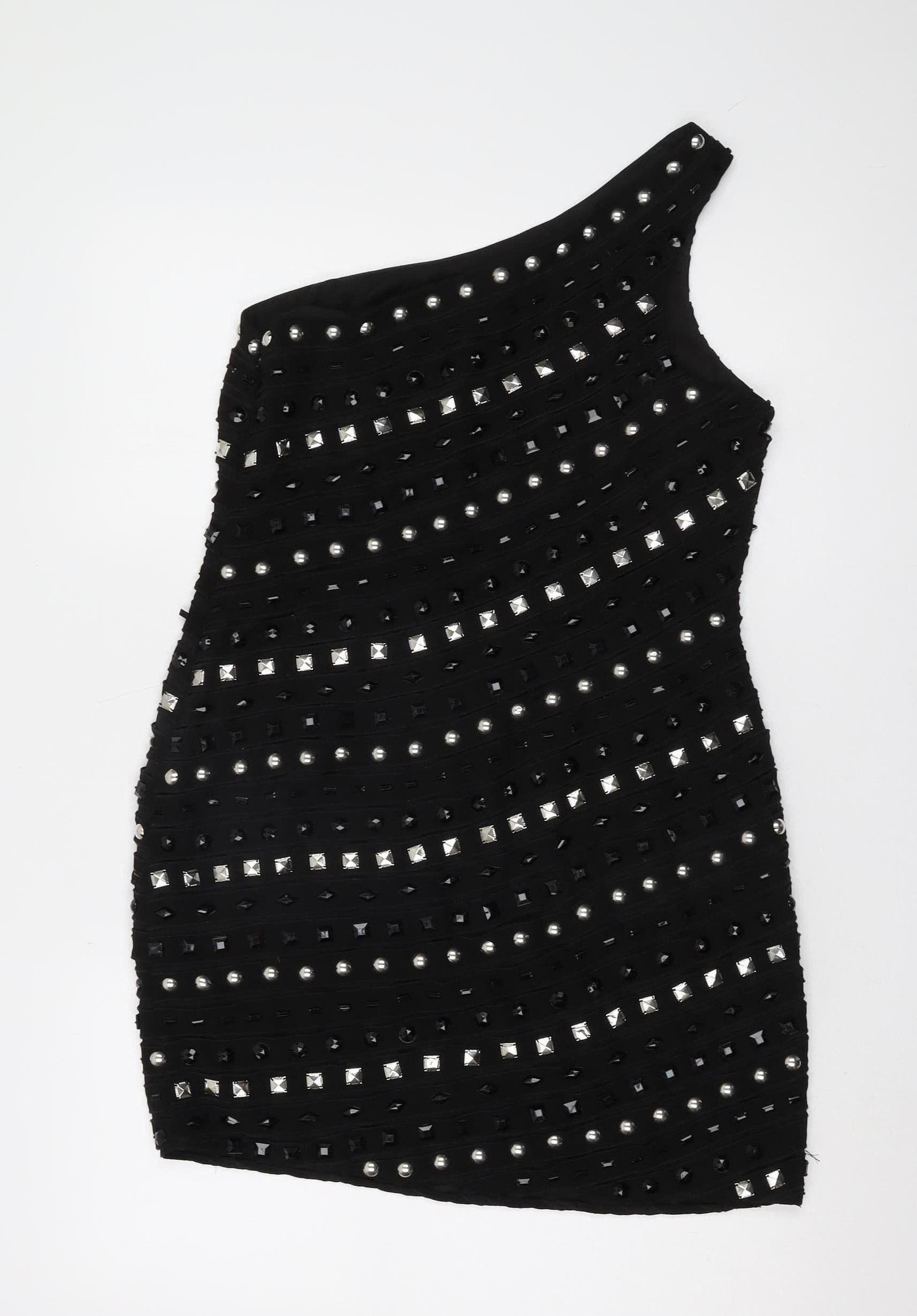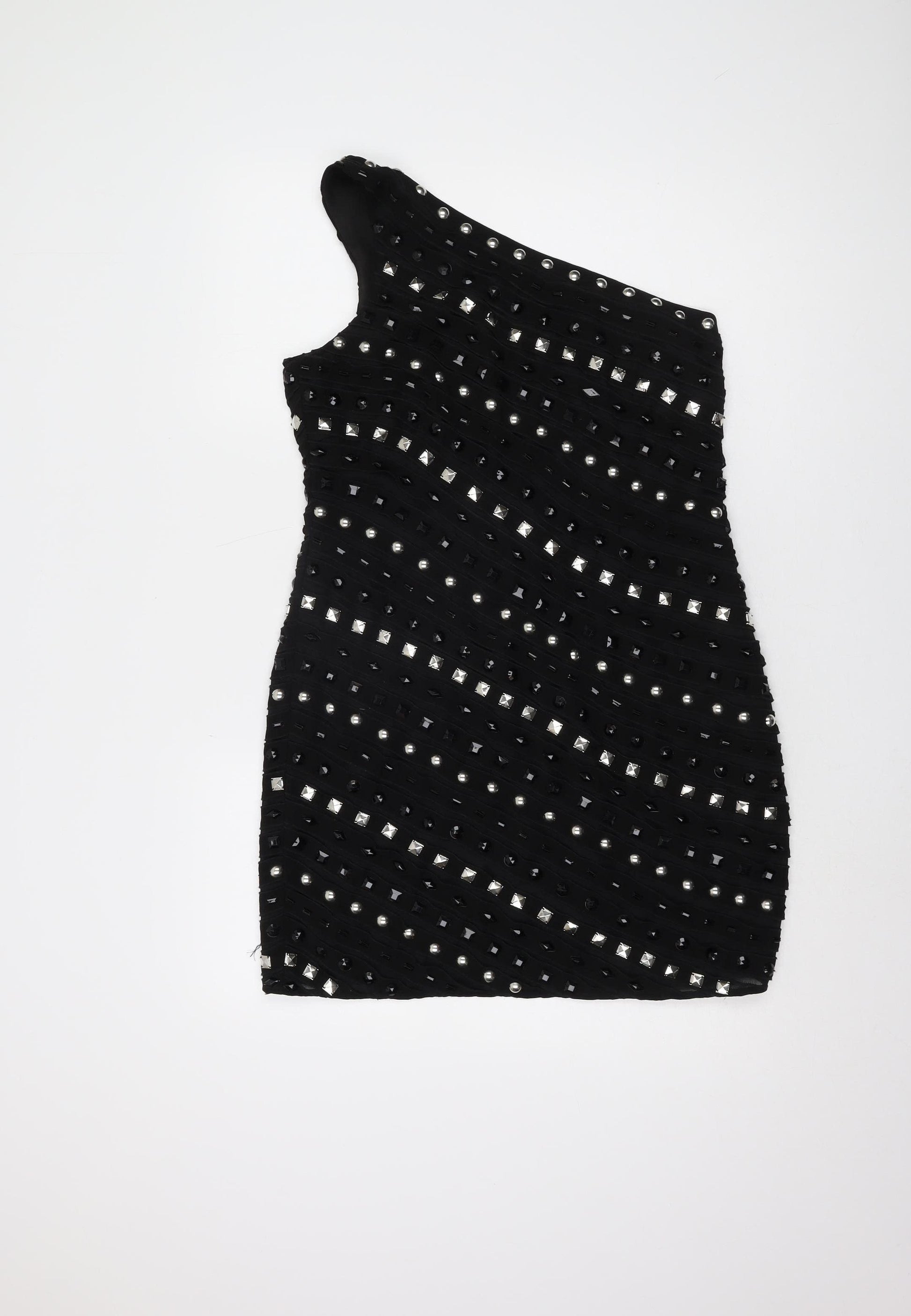 Step into the spotlight with this stunning black bodycon dress from Warehouse. Perfect for parties and special occasions, this mini dress features a stylish one-shoulder design that brings a touch of elegance and modern flair. The asymmetrical sleeve adds a unique twist, making it a perfect choice for fashion-forward women. Crafted from 100% polyester with a woven finish, this dress not only looks great but feels comfortable, allowing you to enjoy your night out in style. The addition of eye-catching studs elevates its appearance, ensuring you’ll draw attention wherever you go. Although it's listed as excellent condition, rest assured there's no visible wear, giving you the confidence of wearing a piece that looks brand new. Ideal for cocktail events or any evening where you wish to shine, this dress is an essential addition to your wardrobe. Don’t miss the chance to own this alluring piece at such a competitive price.