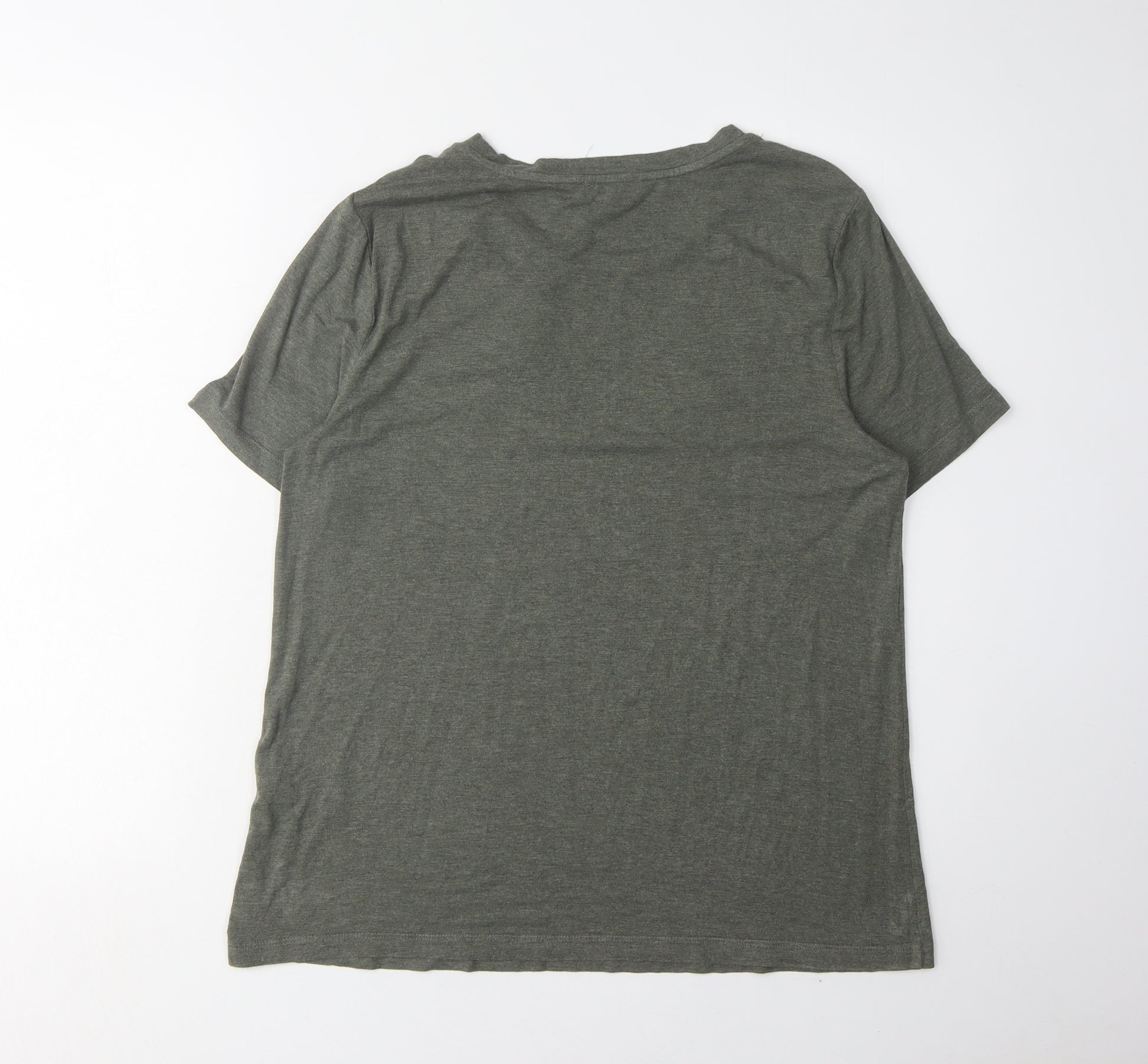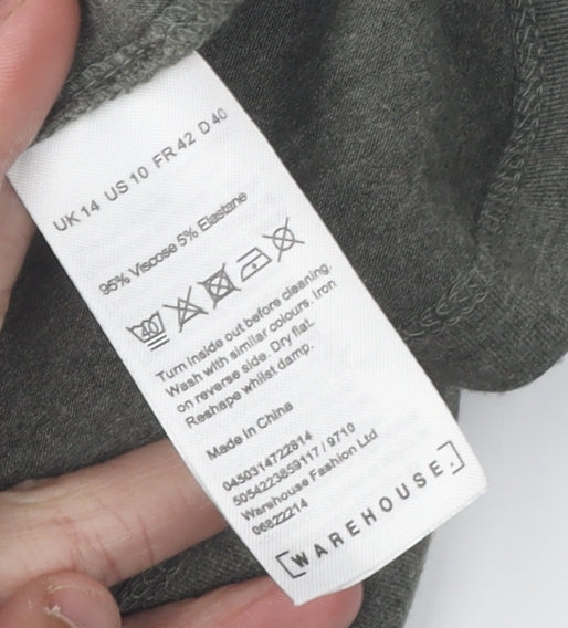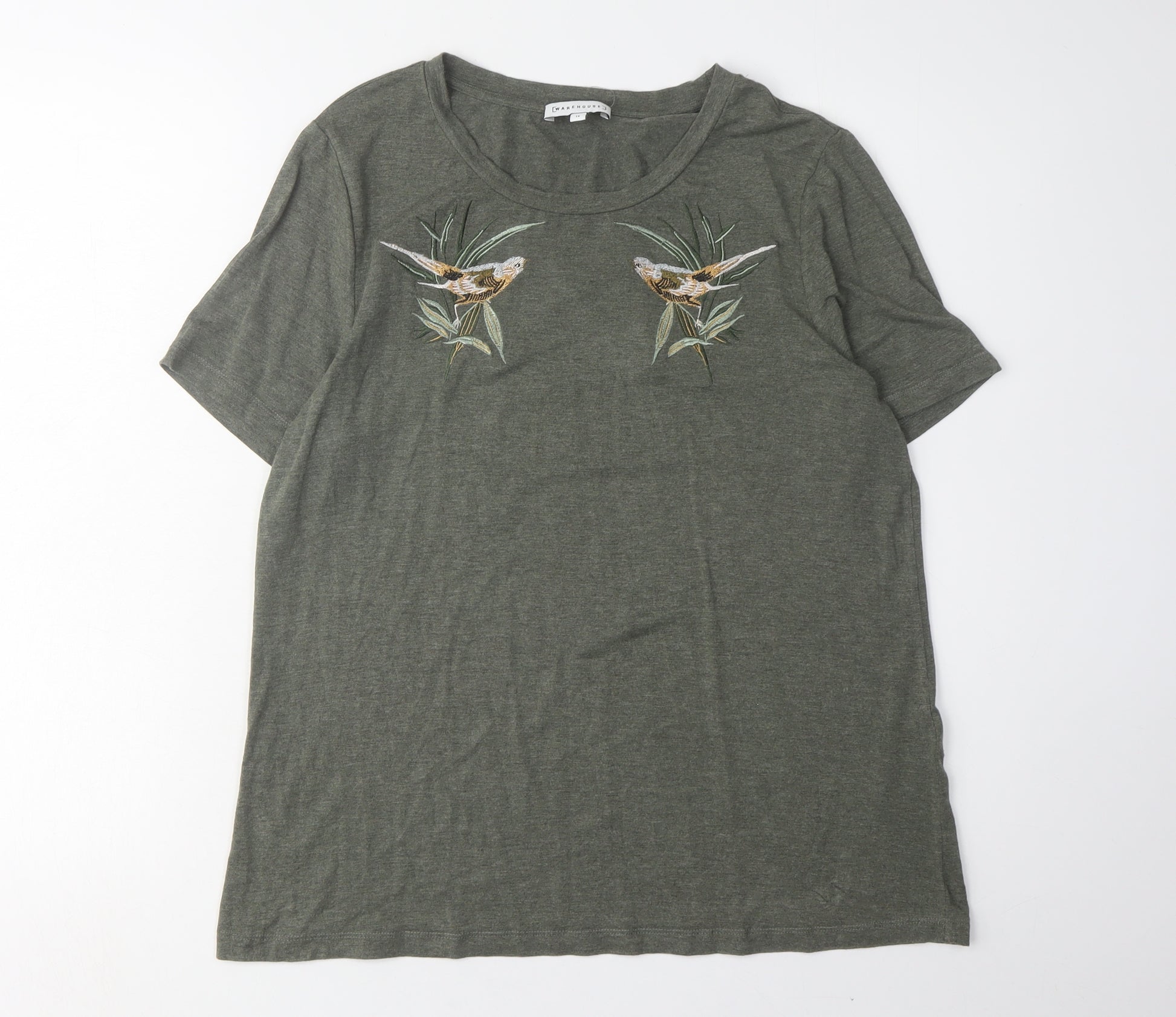 Elevate your casual wardrobe with this stylish Warehouse women's T-shirt, featuring a beautiful embroidered bird motif. Crafted in a versatile green hue, this garment is perfect for nature lovers and those looking to add a subtle pop of colour to their outfit. Made from a soft blend of 95% Viscose and 5% Elastane, the fabric offers a luxurious feel and a comfortable, regular fit. The short sleeves and round neck design make it ideal for all seasons, ensuring you'll stay comfortable whether worn as a standalone piece in summer or layered under a cardigan in cooler months. Accented with delicate embroidery, this T-shirt provides a touch of elegance with its nature-inspired theme. Its solid pattern and classic style ensure it pairs easily with jeans, skirts, or trousers for a variety of occasions, from casual outings to relaxed social gatherings. Conveniently cared for with machine washing, it promises ease and simplicity in maintenance. Keep your style fresh and contemporary with this durable and chic piece from Warehouse, where quality and fashion meet effortlessly. Available in UK size 14.