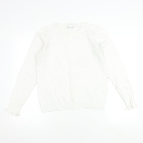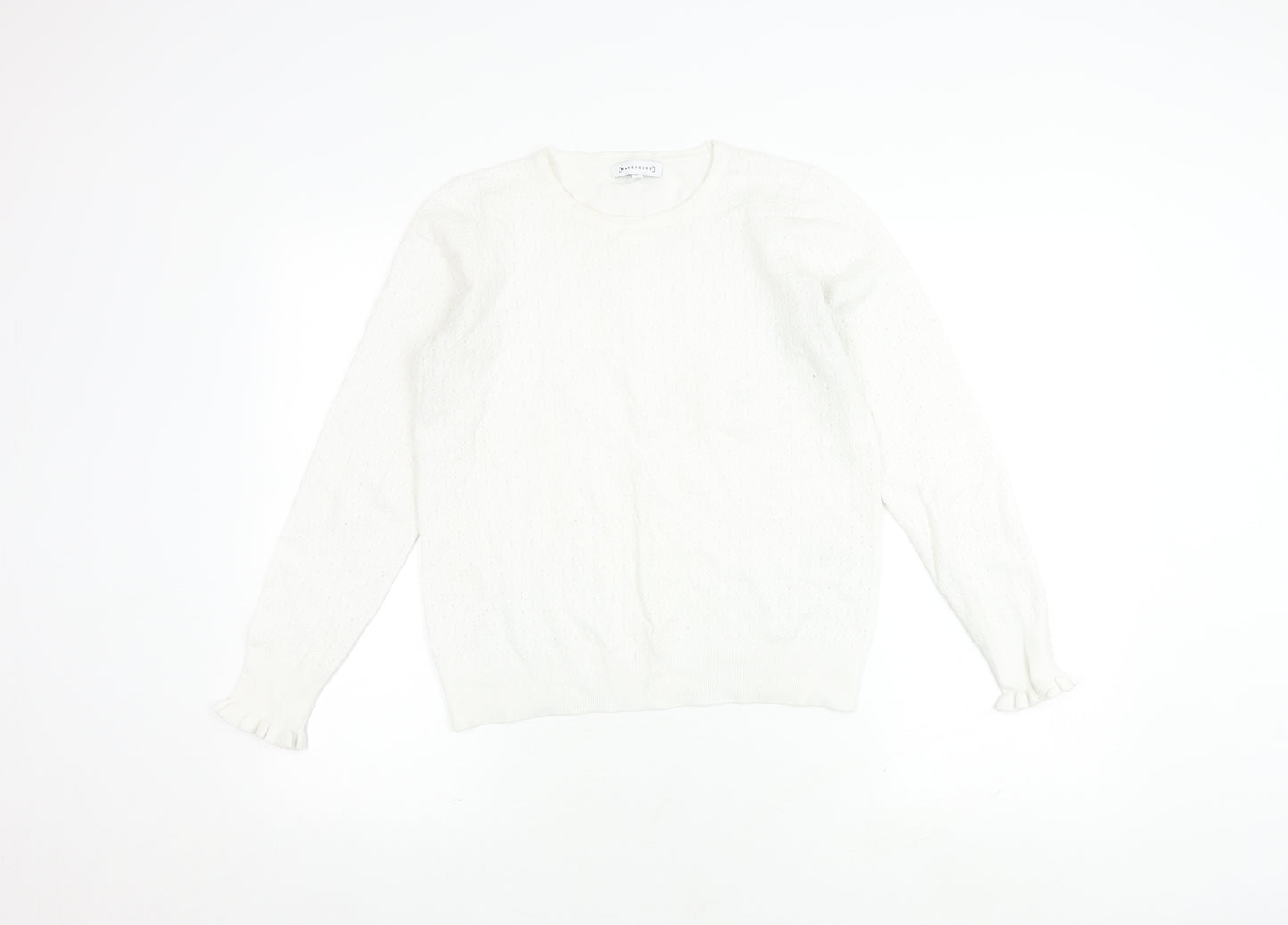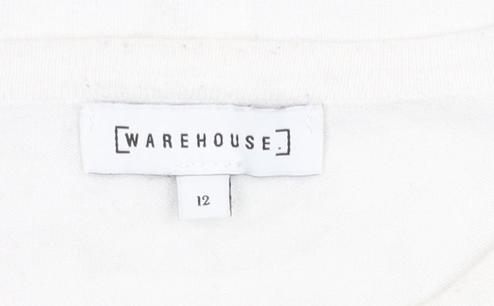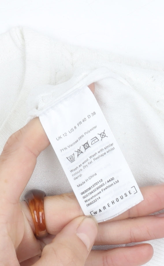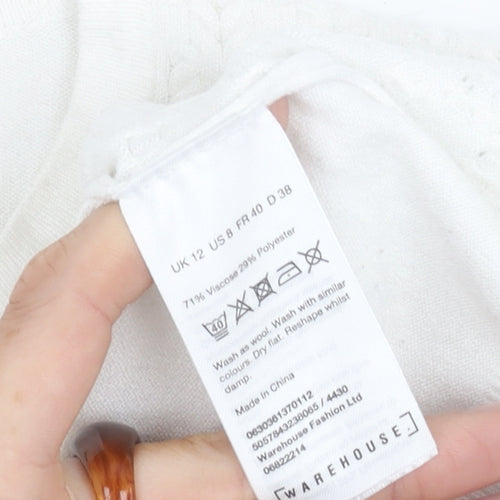 This elegant Warehouse women's jumper is an excellent addition to any casual wardrobe. In size 12, it offers a comfortable regular fit perfect for a relaxed day out or casual office wear. It comes in a classic white colour with a crew neck, making it versatile enough to complement a variety of outfits. The long sleeves add a touch of warmth for all-season wear, while the soft knit fabric provides extra comfort. Crafted from a blend of viscose and polyester, this pullover jumper is both lightweight and machine washable, ensuring convenience and easy care. The jumper is in excellent condition with only slight signs of wear, making it a great choice for those who appreciate quality and style. Whether you’re heading to a casual brunch or spending a day at work, this Warehouse jumper ensures you do so in style.