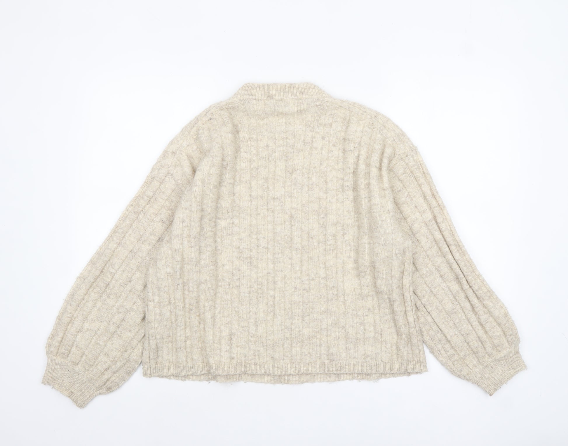 This Warehouse women's beige jumper is the perfect wardrobe staple for cool-weather layering. Crafted with a cosy blend of 72% acrylic, 18% wool, and 10% alpaca, this soft knit offers a beautifully warm and comfortable feel while maintaining a lightweight structure ideal for all-day wear. Designed in a relaxed fit with long sleeves and a ribbed knit texture, it offers both comfort and a touch of contemporary style. The crew neckline and ribbed cuffs create a flattering silhouette suitable for casual days or smart-casual outfits. The neutral beige tone gives this jumper versatile styling potential — perfect paired with jeans for effortless weekend style or layered over a shirt for a laid-back office look. Its rib-knit texture adds interest and dimension to an otherwise classic piece, while the alpaca and wool fibres ensure lasting quality and warmth. Suitable for autumn and winter, this jumper strikes the perfect balance between elegance and practicality. A timeless pullover with a soft-to-touch finish, this Warehouse design lends itself to easy coordination and everyday wear. Its relaxed fit and puff-style sleeves lend a subtle modern touch while maintaining classic appeal. Machine washable for convenience, it’s an easy-care addition to your wardrobe that will keep you stylish and comfortable throughout the season. If you’re looking for a versatile knit that combines luxury texture, everyday comfort, and understated chic, this Warehouse jumper makes a perfect choice. Pair it with tailored trousers and boots for an elevated winter look or throw it over a midi dress for a relaxed, feminine twist. Condition is excellent with minimal signs of wear, making it an ideal pre-loved find with plenty of life and style left to give.