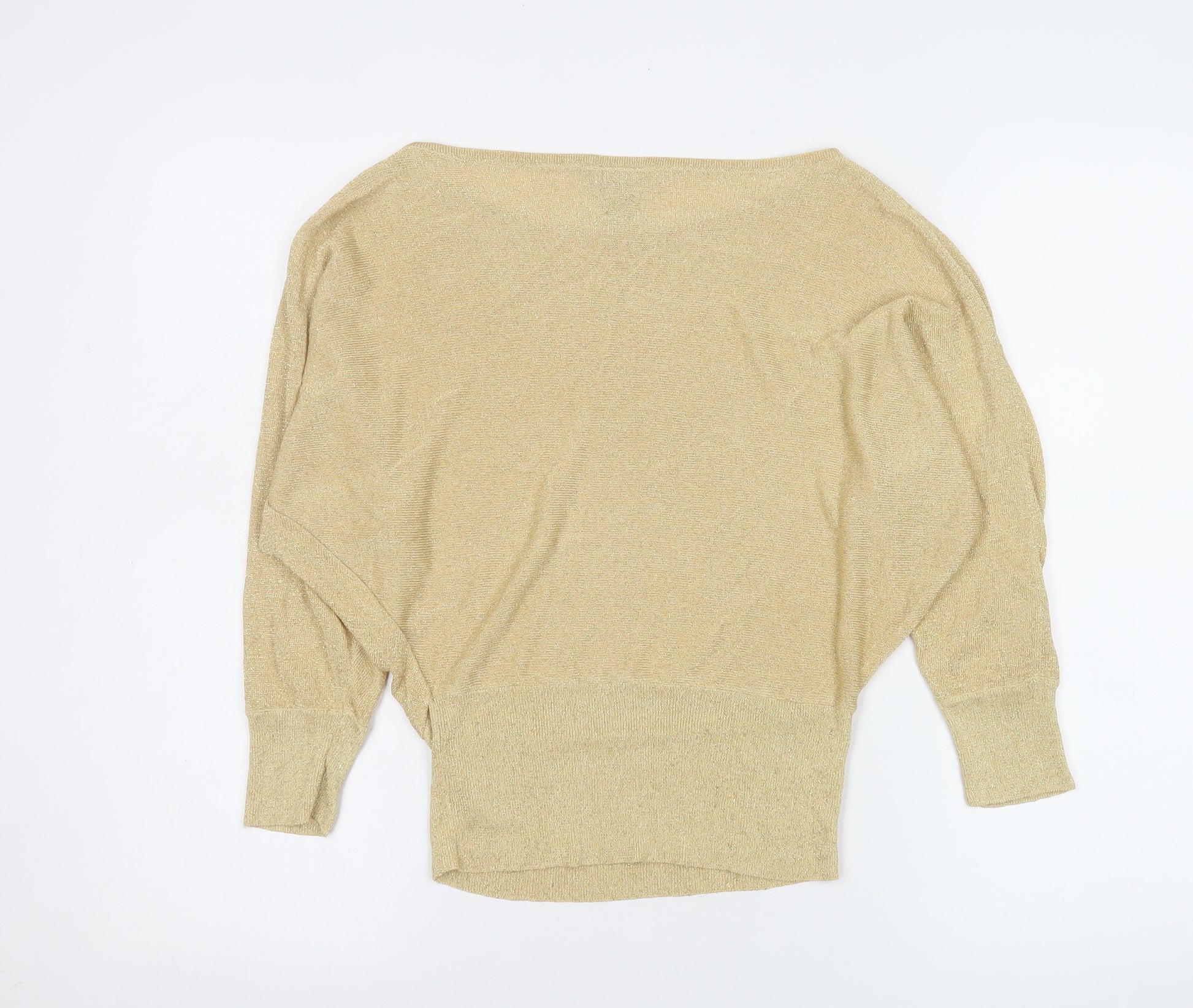 Elevate your wardrobe with this elegant Warehouse Women's Beige Metallic Batwing Jumper, perfect for effortlessly chic styling across multiple seasons. Crafted from a soft and slightly shimmery knit blend of 85% viscose, 10% nylon, and 5% metallic fibres, this piece brings a subtle sparkle while remaining comfortable and breathable against the skin. The relaxed, dolman sleeve design offers a flattering drape that complements all body shapes, while the boat neckline adds a graceful and timeless touch.This Warehouse jumper is a versatile essential, ideal for transitioning between casual daywear and evening sophistication. Pair it with tailored trousers for a refined office look or dress it down with jeans for a weekend brunch. The ribbed hem and cuffs provide structure to the flowing silhouette, making it both stylish and practical. The beige metallic hue lends a warm, neutral tone that pairs beautifully with both bold colours and classic neutrals, meaning this top will easily blend into any wardrobe.The pullover design makes dressing effortless, while the lightweight, stretch knit fabric ensures freedom of movement and a flattering fit. Perfect for autumn through winter, or cool spring evenings, this pullover blouse exudes understated glamour suitable for casual outings, cosy gatherings, or chic nights out. Designed by Warehouse, known for their contemporary yet timeless pieces, this top combines quality construction with fashion-forward sensibility.In excellent pre-loved condition, showing minimal signs of wear, this garment remains well maintained and ready to wear. Whether you’re dressing for a dinner, casual event, or simply want to add a touch of metallic shimmer to your everyday ensemble, this Warehouse beige knit jumper makes an excellent choice. A must-have addition for anyone looking for comfort, style, and subtle luxury in their wardrobe.
