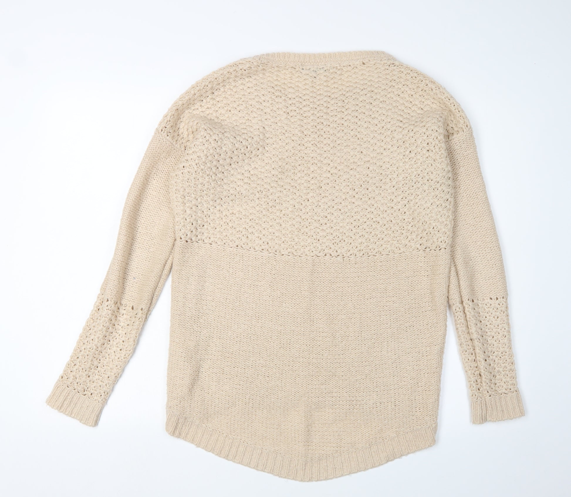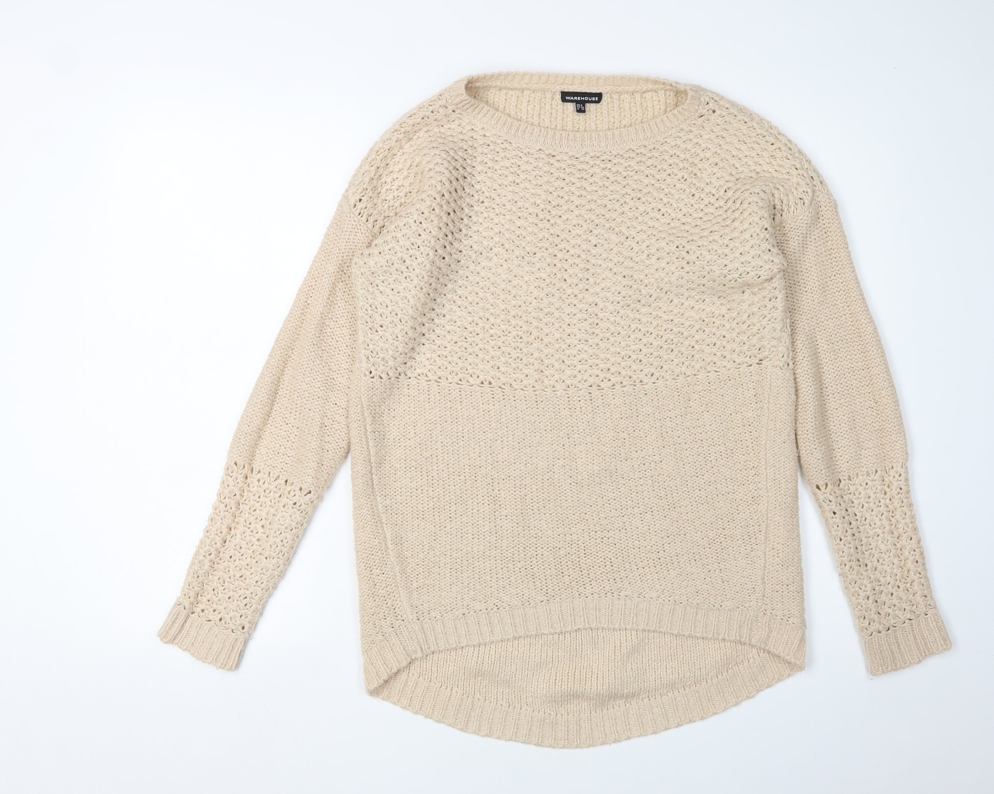 Elevate your casual wardrobe with this stylish beige pullover jumper from Warehouse. Perfect for the autumn and winter seasons, this women’s jumper is designed with a crew neck and long sleeves, offering a cosy and regular fit. Crafted from a soft cotton blend, the knit style is open-knit, ensuring breathability while keeping you warm. Its neutral beige colour makes it a versatile piece, easily matched with jeans or skirts for a relaxed yet chic look. This jumper is ideal for casual occasions, allowing you to maintain comfort and style effortlessly. The fabric is machine washable, making it convenient for easy care. Despite slight wear visible, it remains in excellent condition and is a valuable addition to any fashion-savvy individual’s collection. Snag this comfortable and trendy jumper at an appealing price and enjoy its timeless design.