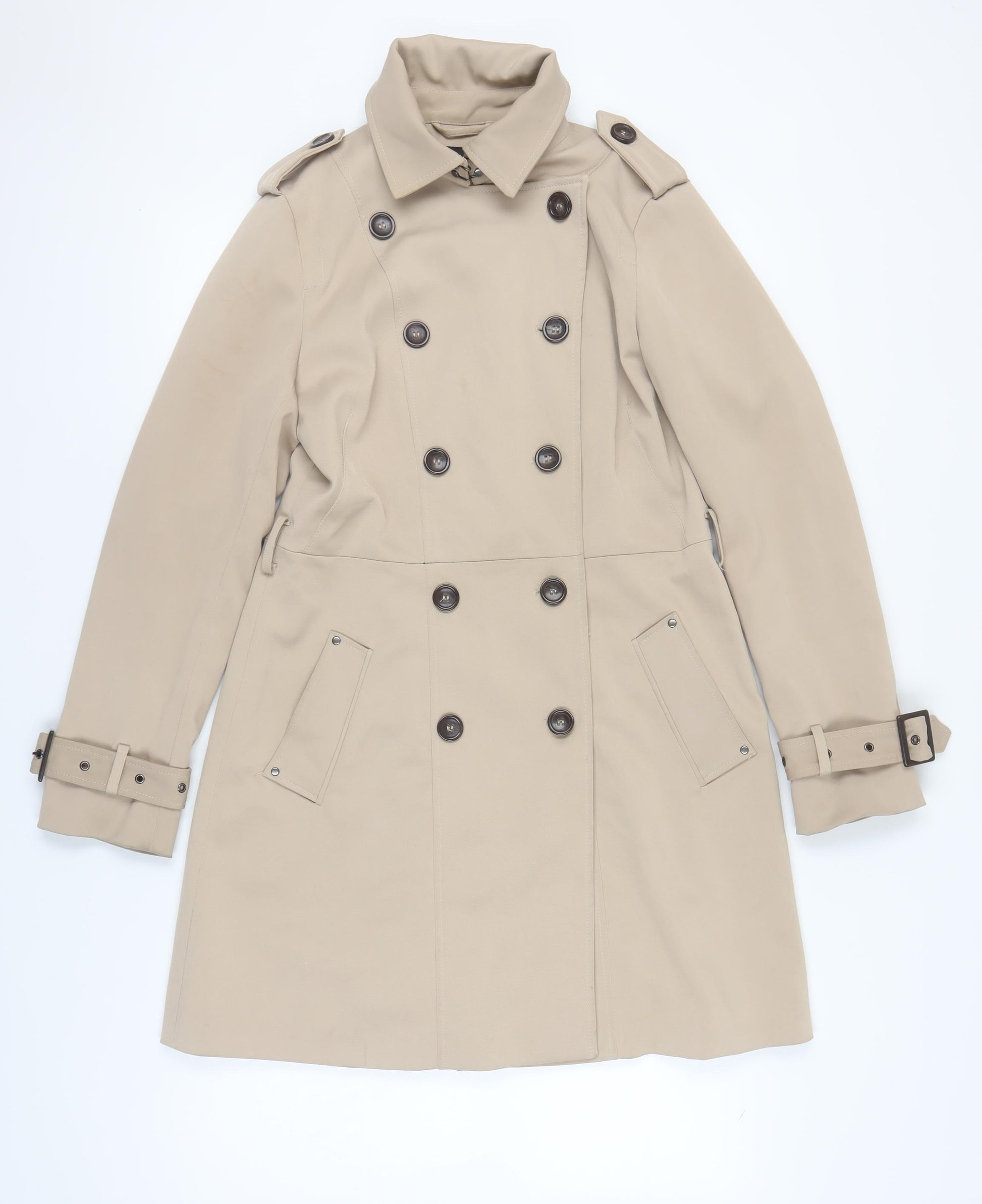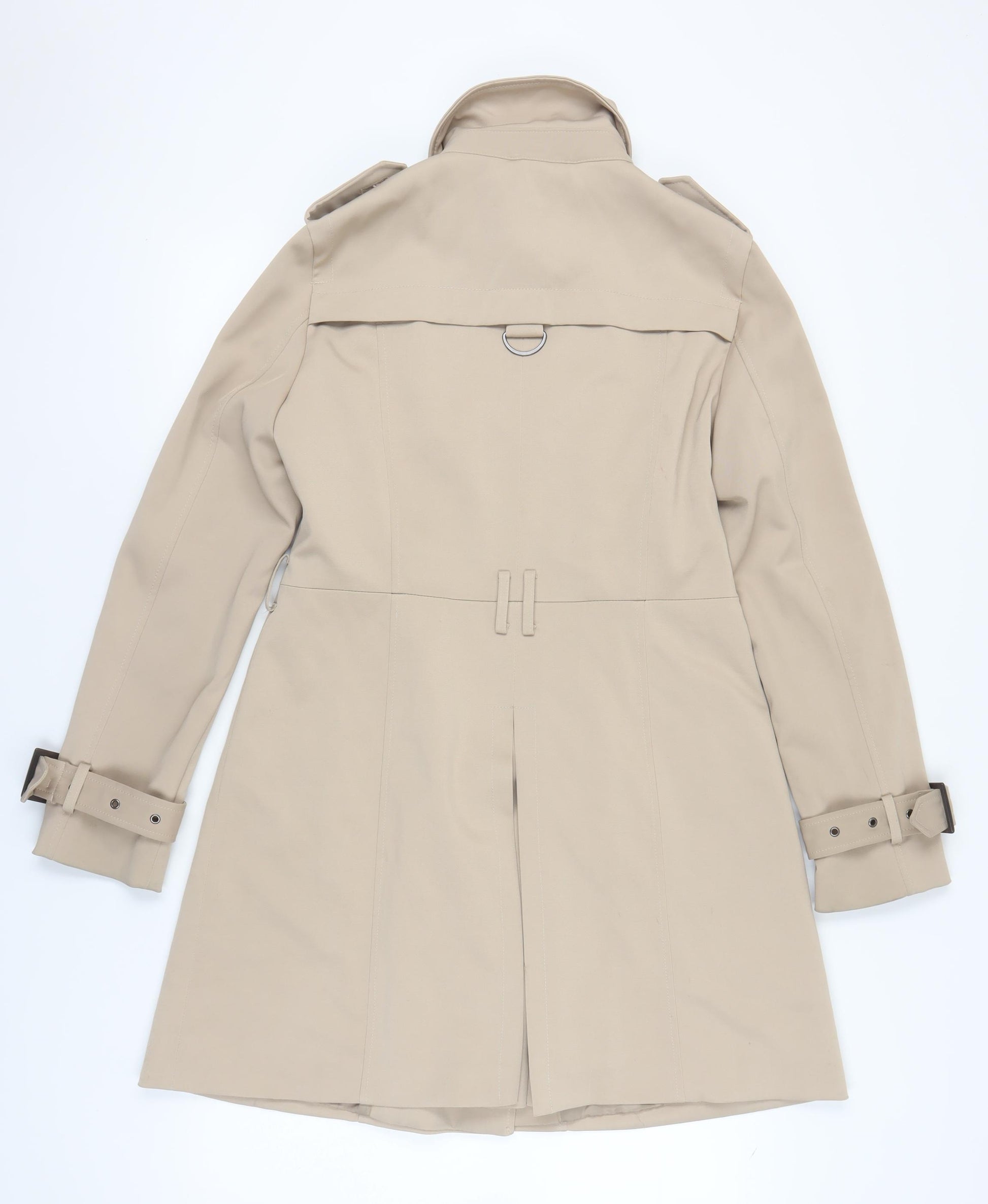 Discover timeless elegance with this Warehouse women's trench coat. Designed in a versatile beige hue, this mid-length coat is perfect for both autumn and spring outings. Crafted from a durable polyester outer shell with a smooth polyester lining, it features a classic double-breasted button closure and adjustable belt for a chic silhouette. The coat's twill fabric type adds texture, while its collared design offers a polished finish. Ideal for casual and business settings, its understated accents and regular fit ensure comfort and style. Though previously enjoyed, it remains in excellent condition with minimal signs of wear. Embrace classic fashion with this versatile addition to your wardrobe.