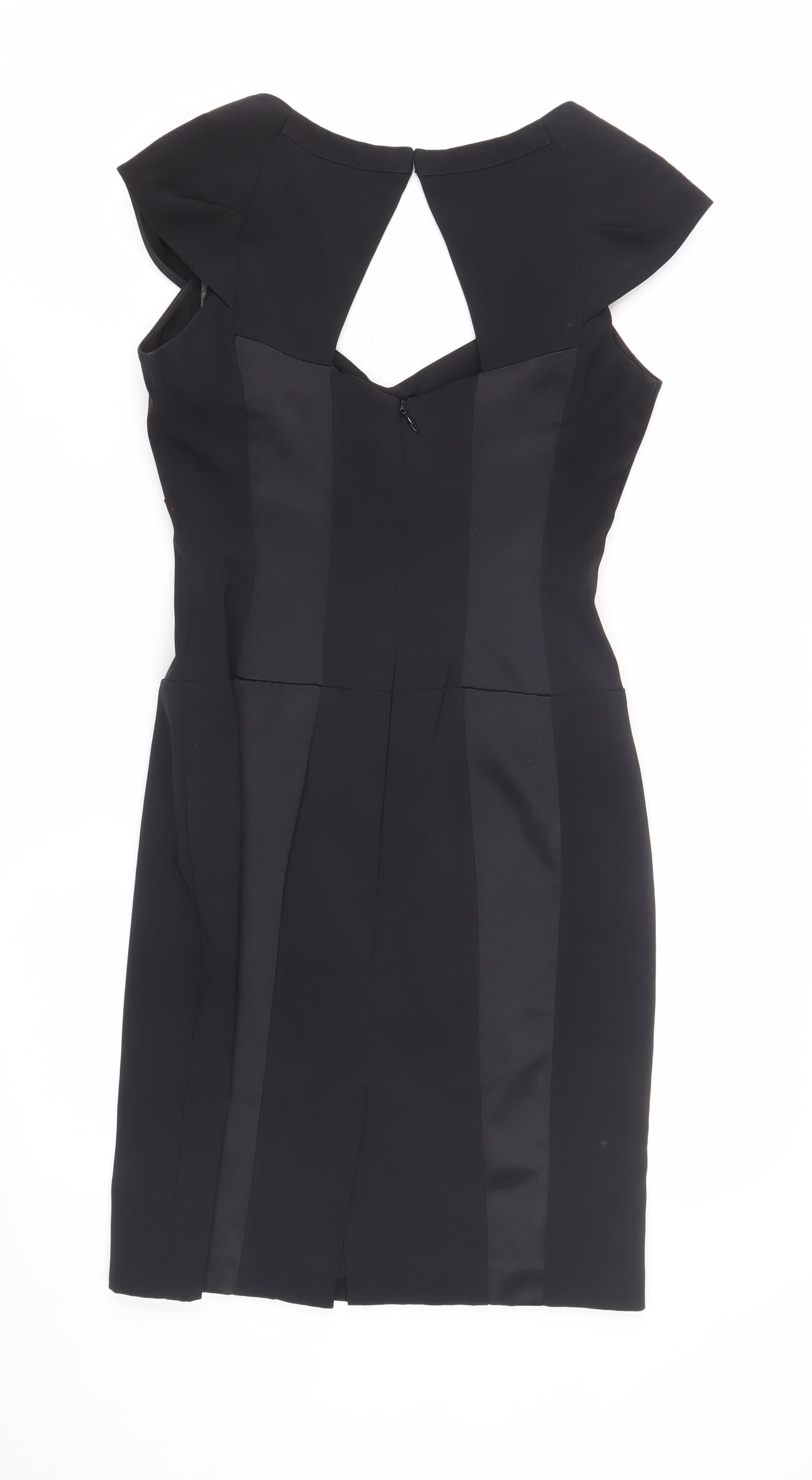 Elevate your wardrobe with this chic Warehouse Women's Black Bodycon Dress, perfect for making a statement at any cocktail party or evening out. Crafted in a sleek bodycon style, this dress contours your body to create a flattering silhouette that exudes elegance and confidence. The knee-length cut provides a sophisticated touch, making it versatile for both formal and casual occasions. Featuring a timeless black colour, this dress is an essential addition to any fashion-savvy woman's closet. Its sleeveless design with eye-catching cap sleeves and a contemporary V-neckline highlights your shoulders and neckline, adding a touch of allure and femininity. The dress is fully lined, ensuring comfort and quality, while the slimming feature offers a flawless drape. Constructed from a durable blend of polyester and elastane, this dress promises a comfortable fit with a hint of stretch, allowing you to move freely and comfortably throughout your event. The convenient zip closure ensures easy dressing, making this dress as functional as it is fashionable. Perfect for autumn and winter occasions, dress it up with a pair of heels and silver accessories for a stylish look. Don't miss out on this versatile and trendy piece to enhance your wardrobe. Secure yours today!