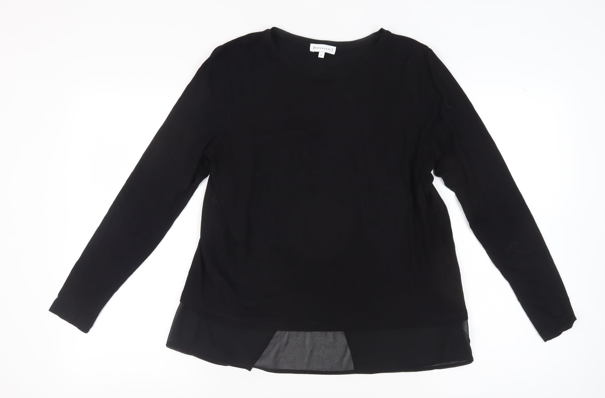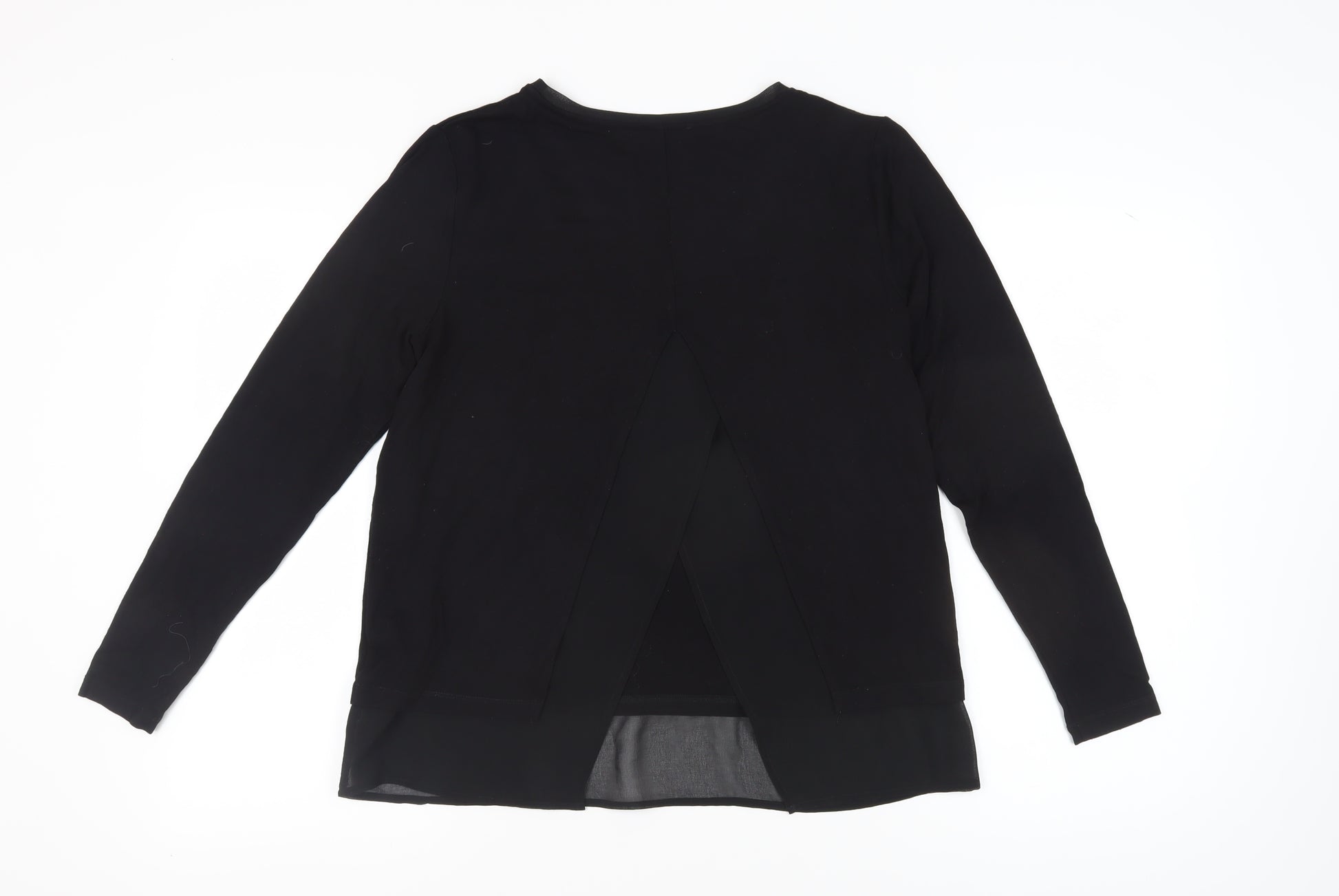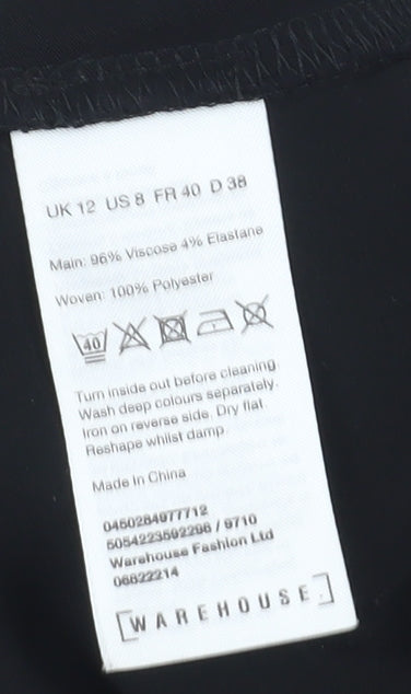 Elevate your everyday wardrobe with this classic black long sleeve top from Warehouse. Crafted for women who value style and comfort, this top features a flattering round neck, offering a timeless silhouette suitable for a variety of occasions. The solid black colour makes it an incredibly versatile addition to your collection, ensuring you can pair it effortlessly with both casual and formal outfits. The main body of the top is made of a soft and smooth mix containing 96% Viscose and 4% Elastane, delivering a comfortable fit with a slight stretch. The woven back adds visual interest and is made from 100% durable Polyester for enduring wear. Designed in a UK size 12, this regular fit top will provide a relaxed yet structured look, perfect for styling with jeans or an elegant skirt. Whether you're heading to the office, enjoying a casual lunch, or attending a stylish evening event, this top transitions seamlessly to match your lifestyle. Easy to care for, this top is machine washable, allowing you to keep it looking fresh with minimal effort. Its excellent, gently worn condition ensures longevity while keeping the garment in superb shape. Priced at an attractive £12.00, it presents an excellent opportunity to enhance your fashion collection without breaking the bank. Don't miss the chance to make this essential piece a staple in your wardrobe.