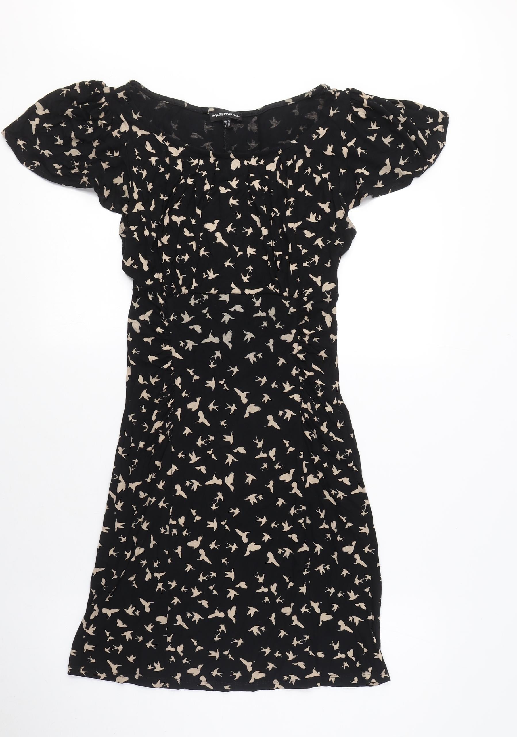 Discover elegance and charm with this stunning Warehouse shift dress, perfect for both casual outings and vibrant cocktail parties. Crafted from luxurious woven viscose, this dress has a lightweight and breathable feel, making it perfect for spring and summer wear. The bold black base is beautifully adorned with an eye-catching animal print, sure to turn heads and make a statement. The dress features a flattering scoop neck that flows effortlessly into a relaxed shift style, offering comfort without compromising on style. Short puff sleeves add a playful touch, while the ruched detail brings a subtle sophistication. Slip into this dress easily with the convenient pullover closure, making it a hassle-free addition to your wardrobe. With its versatile silhouette, it pairs wonderfully with both flats for a laid-back look or heels for a more formal affair. Elevate your style with this Warehouse Women's Black Puff Sleeve Shift Dress and enjoy the perfect blend of comfort and glamour.