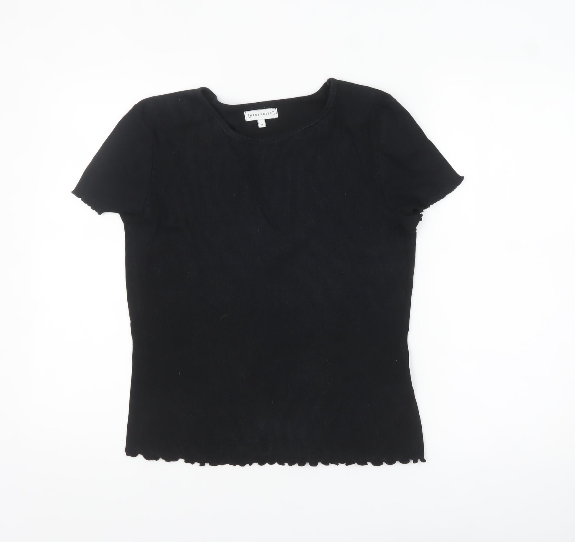 This Warehouse women's black jersey T-shirt is a timeless wardrobe essential offering both comfort and classic style. Crafted from a soft and breathable cotton and elastane blend, this top ensures a flattering fit with just the right amount of stretch for everyday wear. The short sleeves and crew neckline make it a versatile option that transitions effortlessly from casual day looks to more polished outfits. The solid black colour makes it a perfect layering piece that pairs well with jeans, skirts or tailored trousers. The fitted silhouette flatters the natural shape without being restrictive, while the high-quality ribbed cotton fabric ensures long-lasting comfort. Designed with simplicity in mind, this top sits comfortably against the skin and features neat edging for a clean finish. Ideal for any season, whether worn alone during warm months or under cardigans and jackets in cooler weather, the minimal design makes it easy to style for work, leisure or travel. With its soft touch and durability, this Warehouse T-shirt brings practicality and laid-back sophistication to your everyday wardrobe. In very good pre-loved condition with no visible flaws, it remains fresh and ready for many more wears. A reliable staple piece that effortlessly combines comfort, versatility and timeless appeal, this T-shirt is perfect for the modern woman who values quality basics with a refined finish.