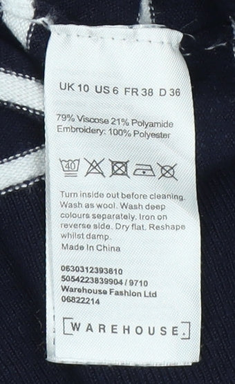 Enhance your casual wardrobe with this stylish women's pullover jumper from Warehouse. Designed with a classic crew neck and long sleeves, this piece offers comfort and timeless appeal. The striking black and white striped pattern is complemented by a beautiful embroidered floral accent, adding a touch of elegance and sophistication. Crafted from a soft knit fabric, this jumper is made up of 79% viscose and 21% polyamide, ensuring a cozy fit. Perfect for casual occasions, it can be easily paired with jeans or trousers for a chic, everyday look. Its regular fit and versatile design make it a must-have addition to your collection. Available in size 10, this jumper is machine washable for easy care. Shop now to add this fashionable and practical piece to your ensemble.