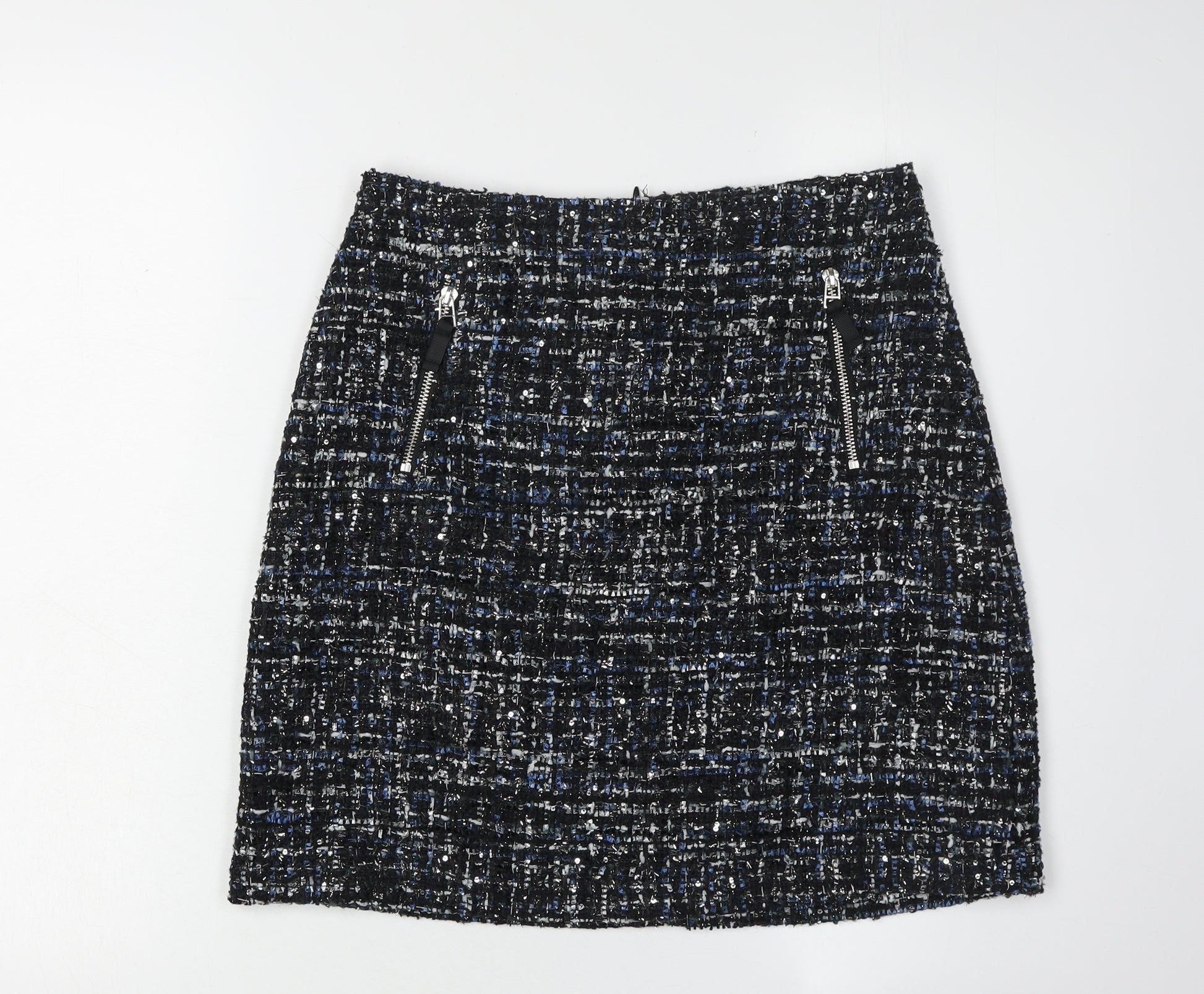 Elevate your wardrobe with this classic yet contemporary tweed skirt from Warehouse, perfect for those who appreciate both style and comfort. Designed for women, this elegant piece is in a sophisticated straight and pencil style, which flatters the silhouette while adding a touch of chic to your ensemble. Crafted from quality polyester, it features a touch of metallic fibre, providing a subtle shimmer and luxurious feel. Its geometric pattern and sleek black colour make this skirt remarkably versatile, seamlessly shifting from a day at the office to evening events. The zip accents lend an edgy touch, enhancing the modern aesthetic. Designed to be worn throughout autumn and winter, its short length is perfect for pairing with tights and boots for a chic look. This piece is in excellent condition, showing no visible signs of wear, ensuring you a timeless addition to your collection. With dry clean only care instructions, it maintains its impeccable structure and quality. Whether it's for a casual day out or a sophisticated gathering, this skirt promises to be a standout piece in your wardrobe.