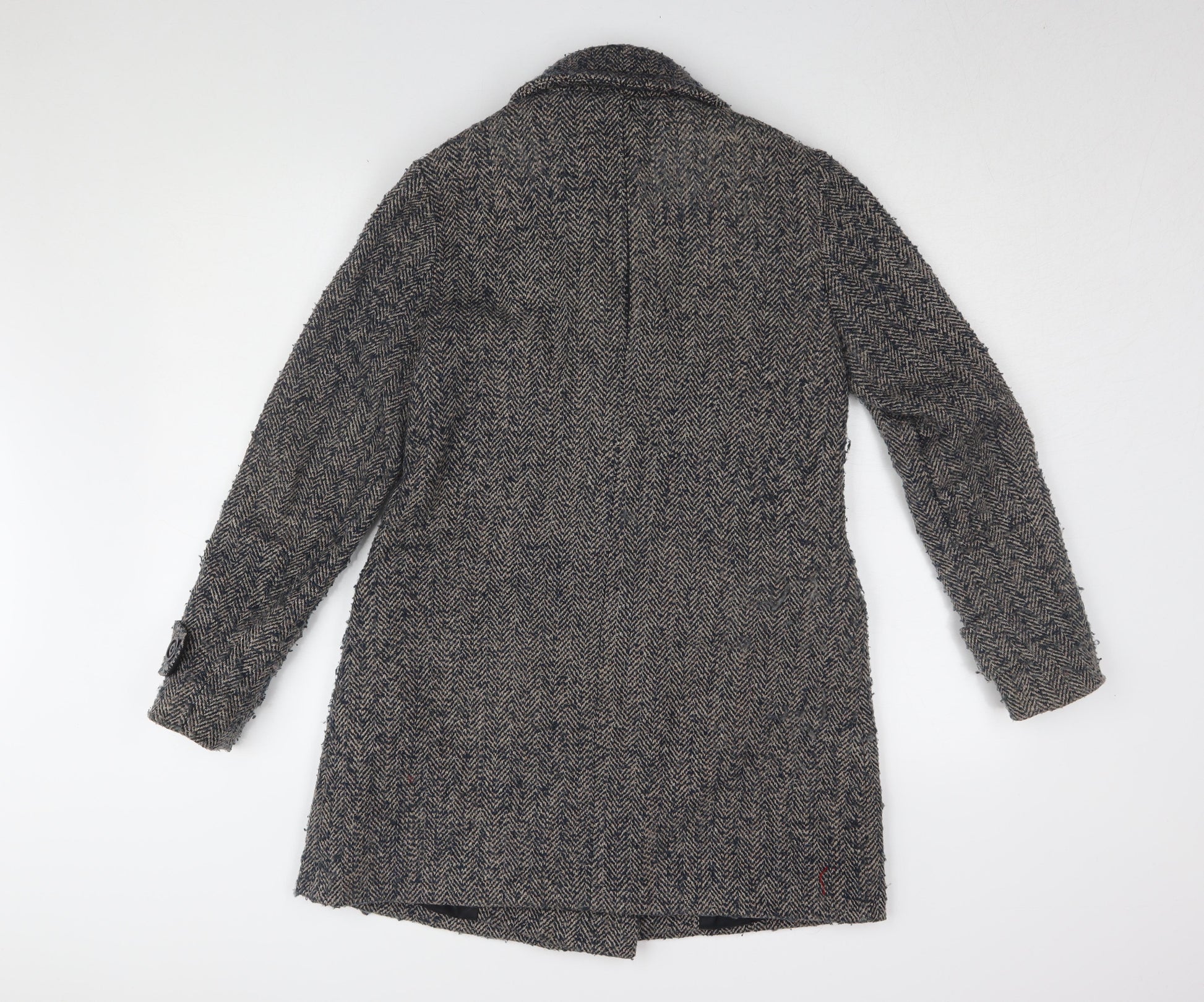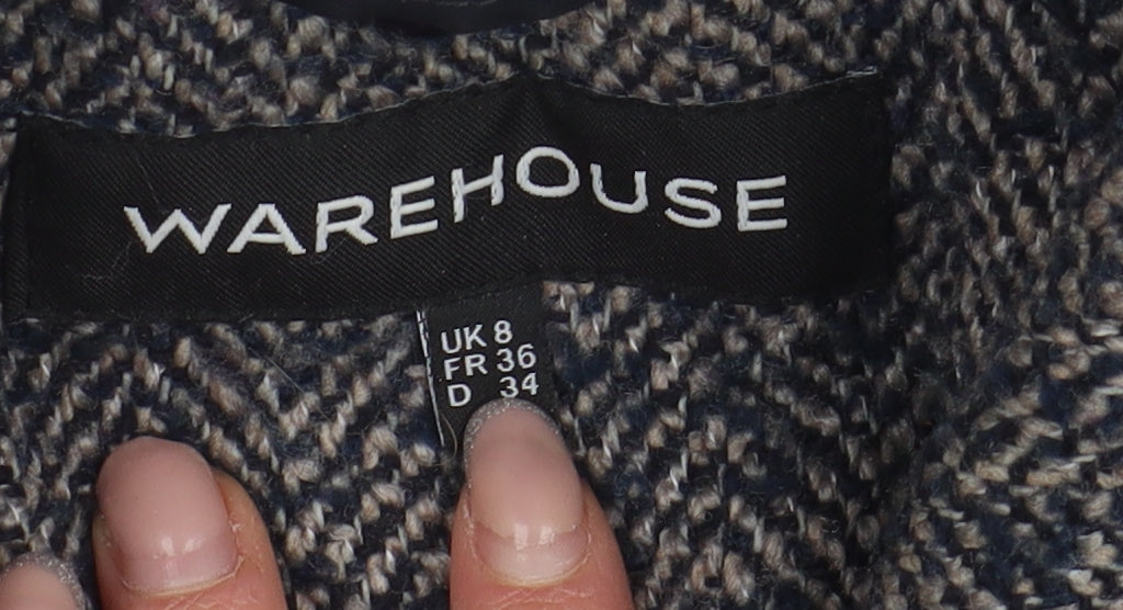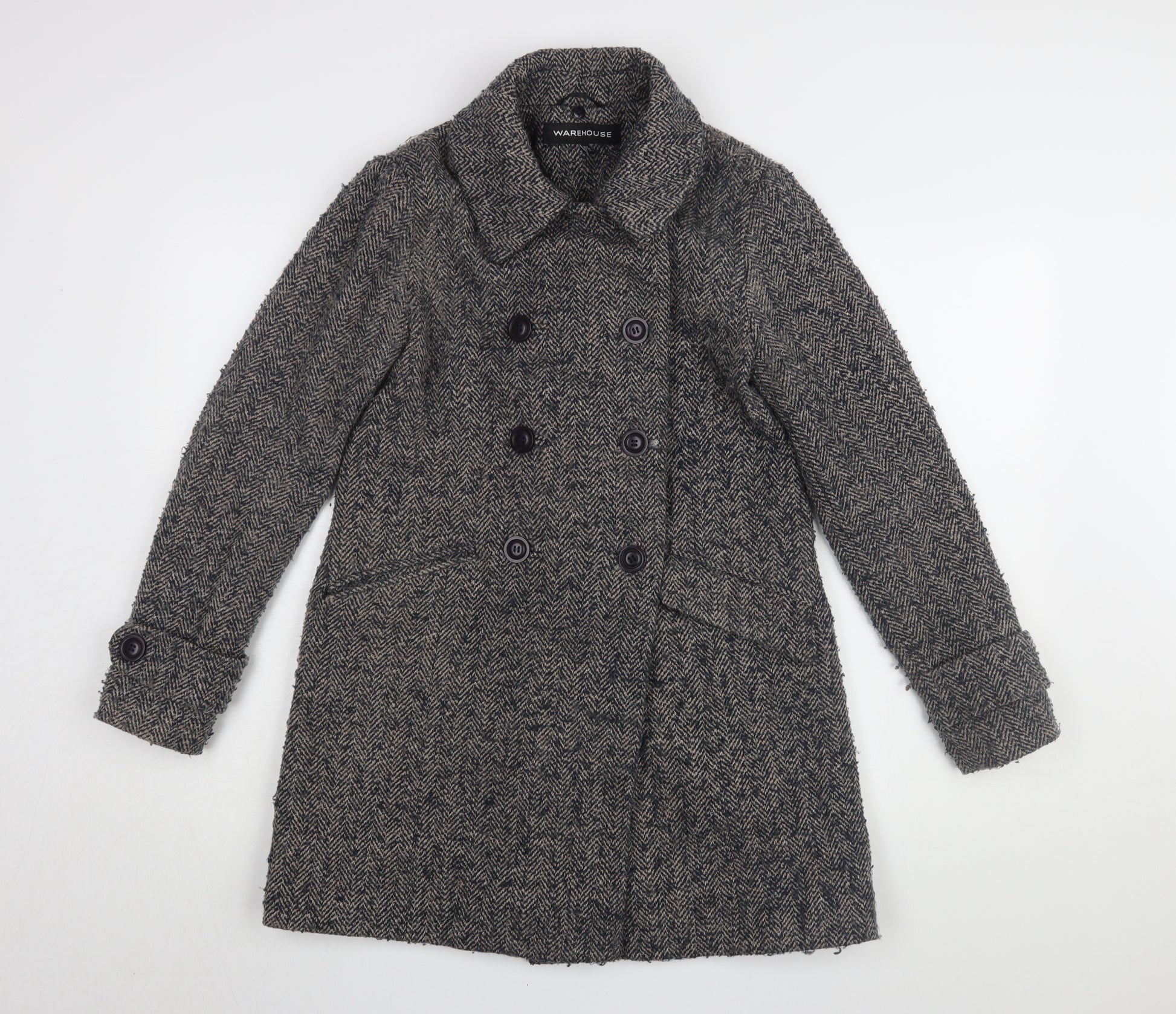 Embrace timeless style with this Warehouse women's pea coat. Expertly crafted from a blend of durable materials including polyester, wool, and cotton, this grey herringbone coat is perfect for the autumn and winter seasons. The long sleeve and collared design add a touch of elegance to both casual and business occasions. The coat's classic button closure and lined interior provide warmth and comfort, making it an essential addition to your wardrobe. With minor wear visible and original tags absent, this very good condition coat offers a sophisticated look at a fraction of the cost. Ideal for those who appreciate quality and fashion, this long-length coat pairs well with various outfits, ensuring you stay stylish on every outing.