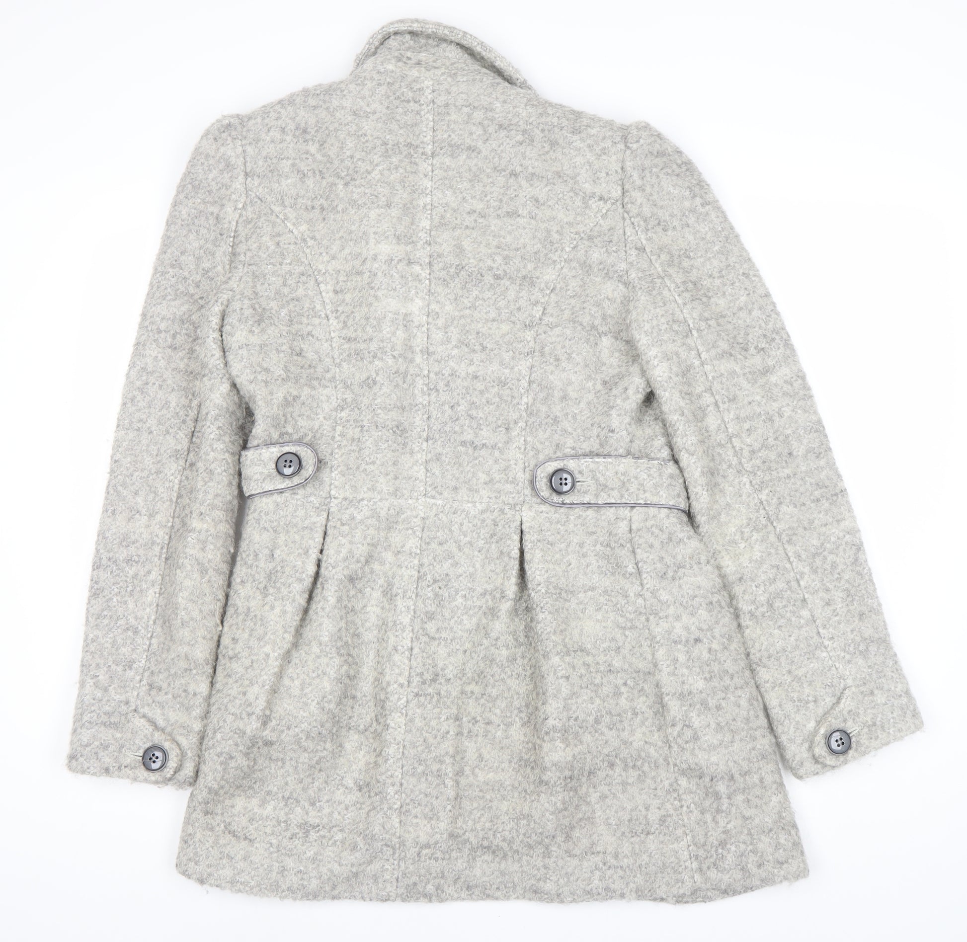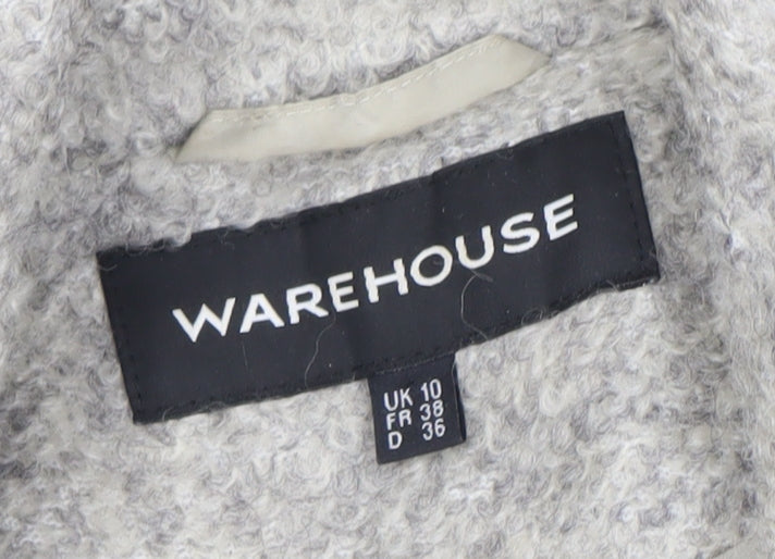 Stay stylishly warm in this classic Women's Pea Coat from Warehouse, designed in a versatile grey to complement any autumn or winter ensemble. Available in size 10, this coat offers a comfortable regular fit, perfect for layering over knitwear or professional attire. Made from a quality blend of 54% polyester and 46% wool, it features a soft, yet durable texture that's ideal for keeping the chill at bay. The coat's design includes a double-breasted button closure, lending a sophisticated touch, while the mid-length cut provides ample coverage against the elements without restricting movement. Fully lined with polyester for additional warmth, it's the perfect choice for both casual outings and workwear, ensuring you maintain a polished appearance. Accented with classic buttons, this coat maintains a timeless appeal suitable for various occasions. Despite being pre-owned, it is in excellent condition, showing only light signs of use with no visible damage – truly a testament to its durability. Priced affordably at £35.00, this coat offers both style and functionality, making it an indispensable addition to your winter wardrobe.