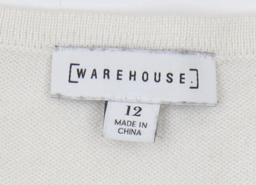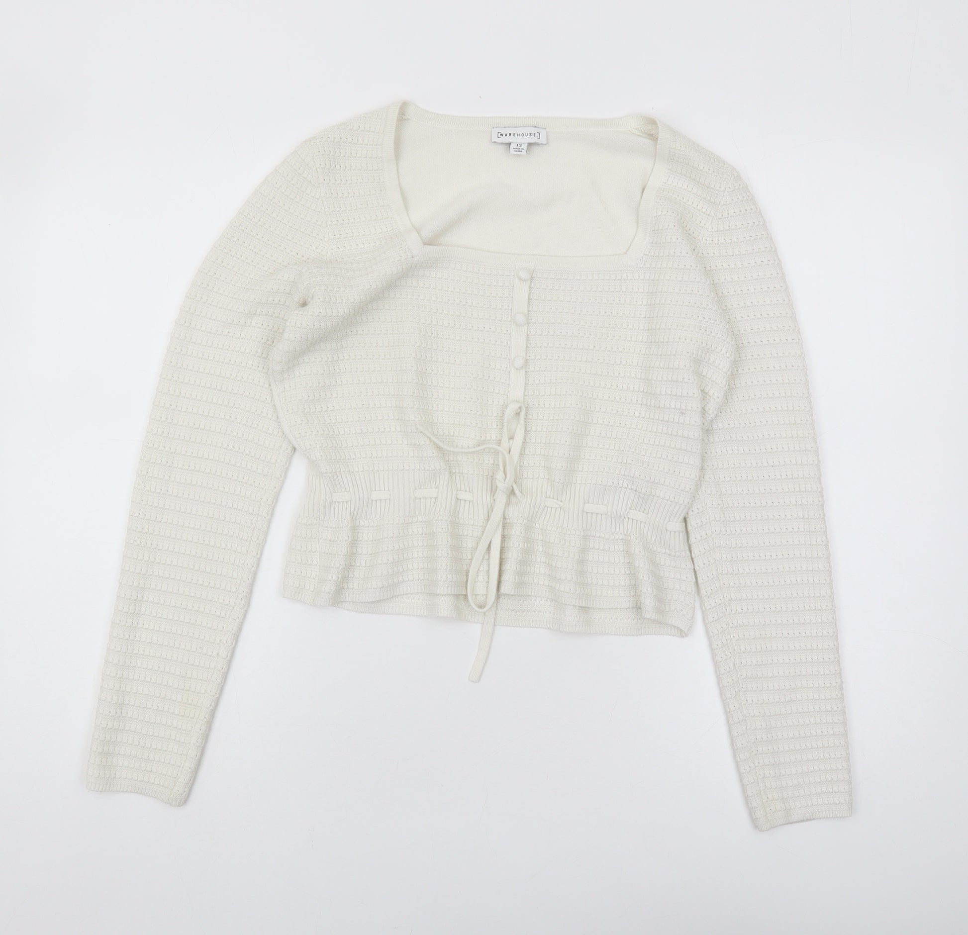 Elevate your wardrobe with this elegant ivory cardigan from Warehouse. The long-sleeve design and waffle-knit texture deliver both style and comfort, making it perfect for autumn and winter days. With a sophisticated square neckline and a stylish button accent, this piece is an ideal addition to any casual outfit. Crafted from a high-quality blend of materials including polyester, acrylic, polyamide, and wool, it provides a soft and warm feel. This cardigan is available in size 12 and features a regular fit, perfect for women looking for a classic and versatile layer. Condition is excellent with no visible flaws, ready to offer warmth and chic appeal. Pair it over a simple top or dress for a stunning, effortless look.