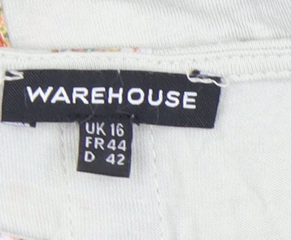 Elevate your wardrobe with this beautiful Warehouse women’s floral blouse, crafted with a mix of soft cotton and durable polyester for both comfort and breathability. Designed in a flattering camisole silhouette, this sleeveless top features a scoop neckline and stylish button accents down the back, adding subtle detail to an otherwise classic design. The multicoloured all-over floral pattern makes it an eye-catching piece that effortlessly combines elegance with everyday wearability. Perfect for warm-weather seasons such as spring and summer, this lightweight and breathable blouse offers versatility for a wide range of occasions, whether you’re heading out for a casual day with friends, enjoying a summer holiday, or dressing it up for a party or evening dinner. The regular fit ensures comfort while maintaining a flattering shape, and its wide shoulder straps provide easy wear, making this piece a stylish yet practical option for your wardrobe. This women’s Warehouse blouse in UK size 16 is a statement floral top that works beautifully paired with tailored trousers, skinny jeans, or a flowing skirt. Its feminine charm and playful colour palette make it a great option for adding a pop of vibrancy to neutral outfits, while also blending effortlessly with other patterns for a more daring style. Condition is very good with only light signs of previous wear and some creasing, but the blouse still looks fresh and stylish. Its machine-washable composition makes it easy to care for and ensures it remains a wardrobe staple for many seasons to come. A perfect choice for anyone seeking a versatile, floral-inspired piece to brighten up their everyday style, this Warehouse blouse is ready to be worn again and again.