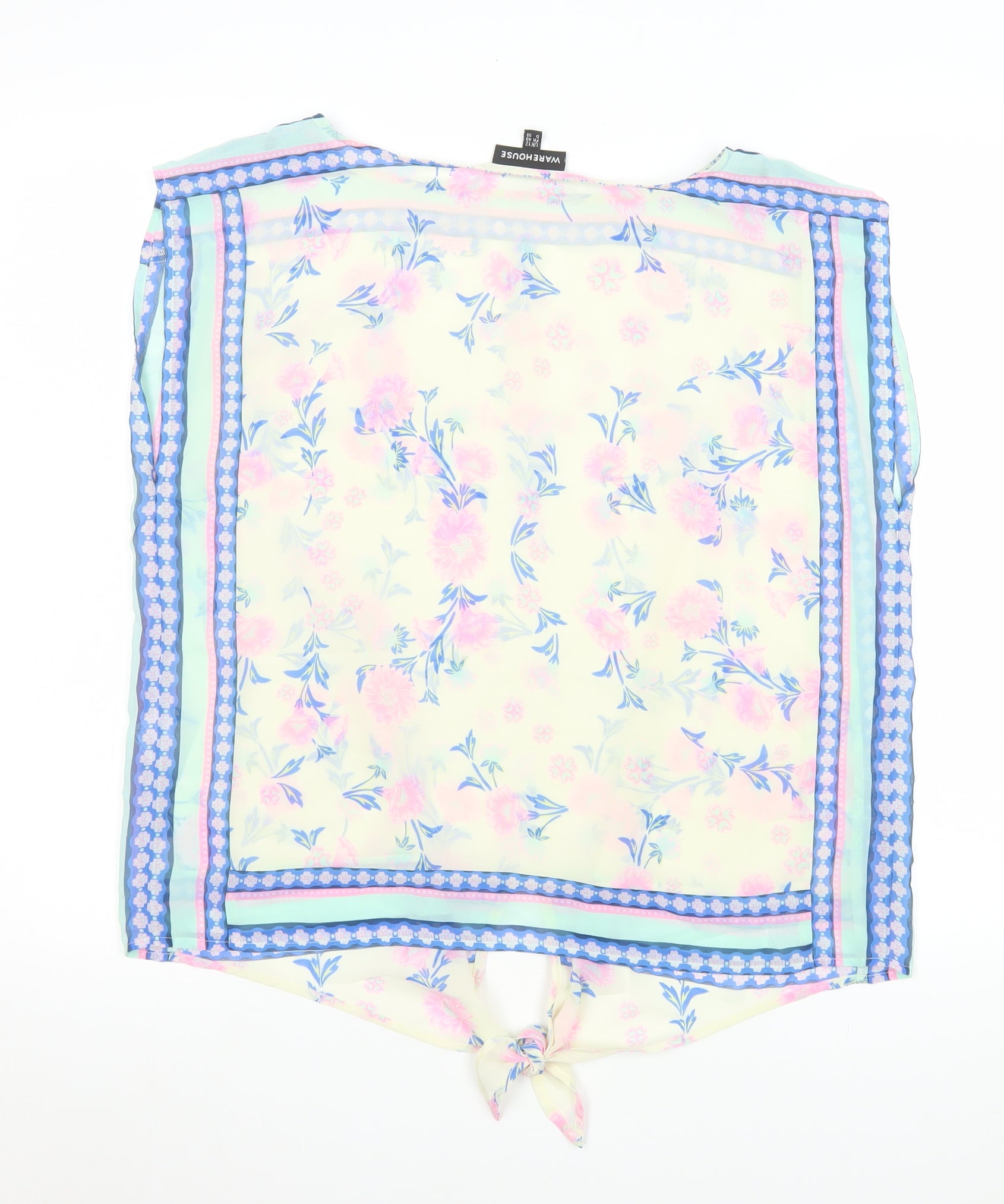 Add a touch of effortless elegance to your warm-weather wardrobe with this beautiful Warehouse Women's Floral Tie Hem Blouse in size UK 12. Crafted from lightweight chiffon with a soft, floaty finish, this sleeveless top brings a fresh, feminine look perfect for both casual styling and holiday wear. The airy material provides wonderful breathability, keeping you cool throughout spring and summer days. The blouse comes in a beautiful mix of soft pastel shades featuring a floral print with delicate pink blossoms and blue leaves bordered by geometric accents. The design is completed with a flattering boat neckline and a tie-front hem, adding shape and a hint of playful detail. This regular fit blouse drapes comfortably over the body, ideal for pairing with jeans, shorts, or a sleek skirt for effortless everyday style. Made from 100% polyester, it is practical and easy to maintain with its machine-washable care feature. Ideal for women seeking light and versatile pieces with a hint of sophistication, this top is suitable for casual outings, day trips, or travel wear. In excellent pre-loved condition, it has no visible flaws or wear marks, making it a quality choice that’s ready to wear immediately. Perfect for those wanting to enhance their wardrobe with chic and adaptable seasonal fashion. With its combination of feminine design, airy fabric, and Warehouse’s trusted quality, this blouse is a must-have for anyone who loves comfortable elegance with a floral twist.