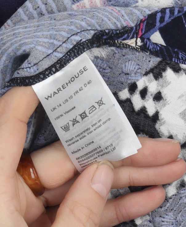 Elevate your wardrobe with this striking Warehouse top, perfect for adding a touch of colour and pattern to any ensemble. The geometric pattern in a delightful multicoloured scheme ensures you stand out, whether you're headed to a casual lunch or a vibrant party. Made from 100% viscose, it guarantees comfort and a flattering fit with its regular size type. The short sleeves with a classic fitted style and a round neckline make it an ideal choice for warm weather. Its machine washable feature adds practicality to its elegant appeal, making it easy to wear time and again. Despite being pre-owned, this top is in excellent condition with no visible flaws, ensuring you get maximum wear from it. The eye-catching geometric print and vibrant colours are perfect for women looking to express their style with a unique and fashionable piece.