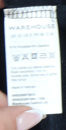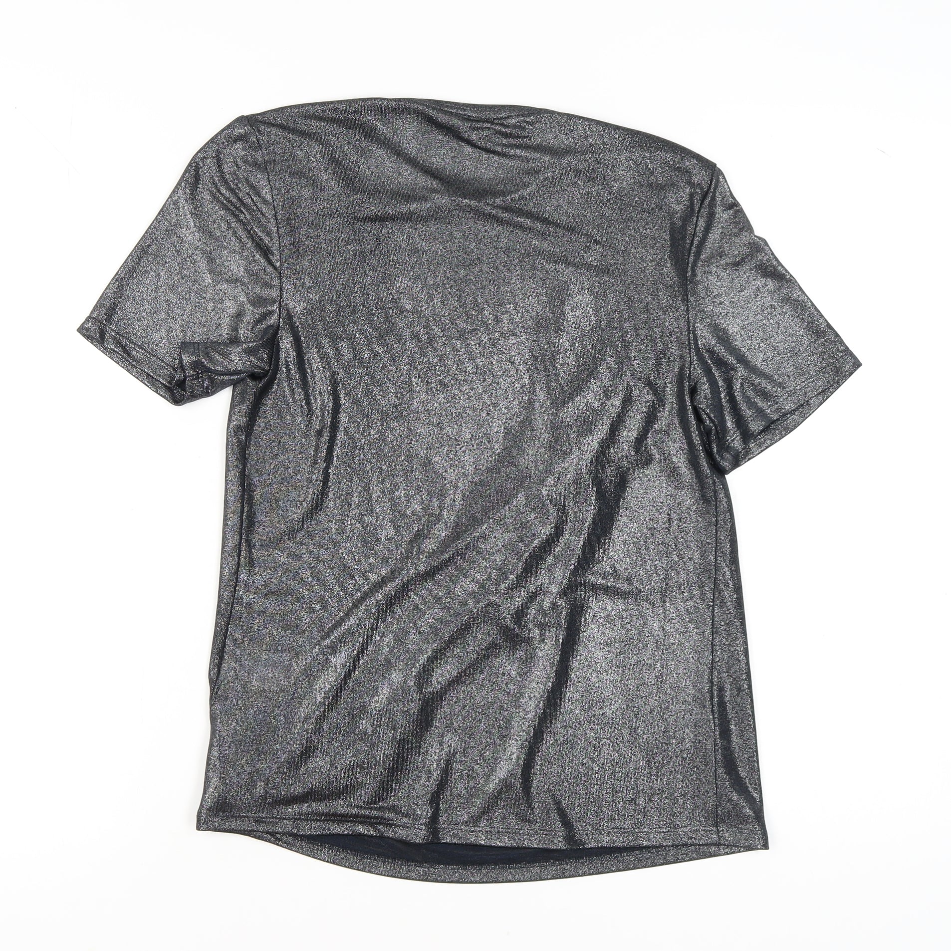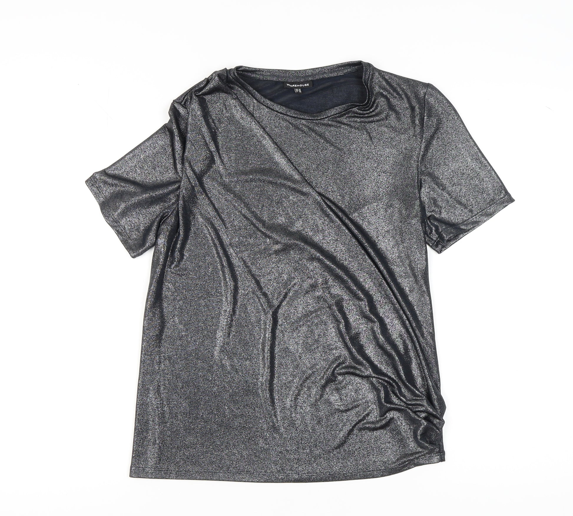 Elevate your casual wardrobe with this stylish Warehouse Women's Basic T-Shirt in a striking silver hue. Crafted with a blend of 91% polyester and 9% elastane, this T-shirt offers both comfort and a slight stretch for a flattering fit. The regular fit features a classic crew neckline and short sleeves, making it a versatile piece for everyday wear. Designed for women looking to add a touch of shimmer to their ensemble, this top is perfect for both casual outings and relaxed social gatherings. Its machine washable fabric ensures easy care and maintenance, allowing you to keep it looking its best with minimal effort. The T-shirt's relaxed style is complemented by its regular size type, offering a comfortable and timeless fit for any fashion-forward individual. Although gently used, it remains in excellent condition, ready to become a staple piece in your wardrobe. Pair it with jeans for a laid-back look, or dress it up with a blazer and accessories for a chic evening ensemble. Don't miss the opportunity to add a touch of sparkle and sophistication to your collection with this beautiful Warehouse Basic T-Shirt.