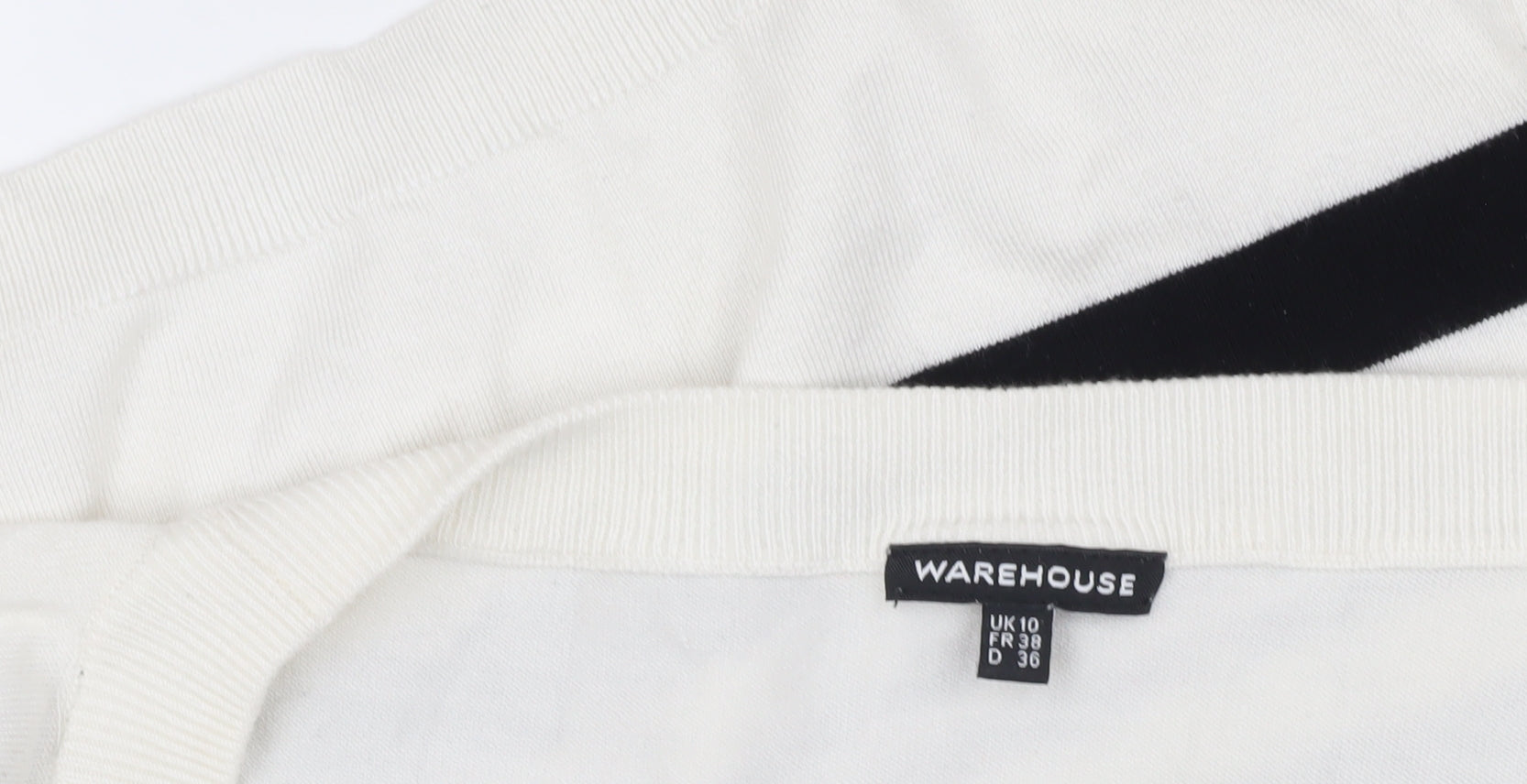 This stylish Warehouse women's pullover jumper features a classic boat neck and long sleeves, offering a timeless and versatile look. Crafted in a soft knit fabric, the jumper is predominantly white with a chic striped pattern, making it a perfect addition to any casual wardrobe. The blend of viscose and polyamide ensures a comfortable and lightweight feel, ideal for those transitional seasons of spring and autumn. With its machine-washable material, it offers easy care practicality. Despite showing very light wear, the jumper maintains excellent condition, making it a bargain for those who appreciate quality fashion. Pair it with jeans for a relaxed outing or dress it up with a skirt for an effortless day-to-night transition. Don't miss the opportunity to own this versatile piece that caters to fashion-conscious women seeking both style and comfort.
