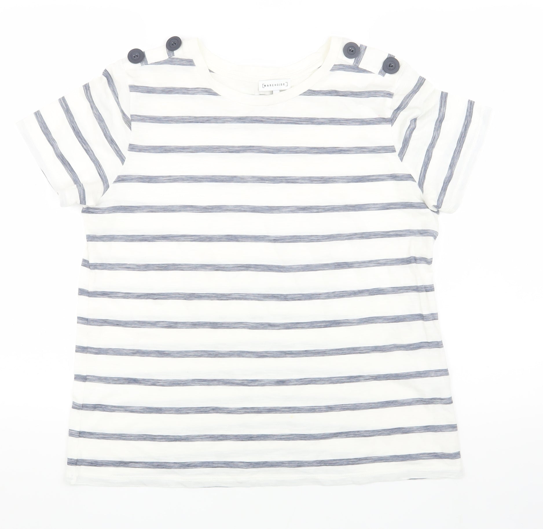 Elevate your casual wardrobe with this chic striped T-shirt from Warehouse. Crafted from 100% cotton, this comfortable and stylish piece is perfect for the summer season. The white base complemented by the subtle stripes adds a touch of elegance to your outfit. Featuring a classic round neck and short sleeves, this T-shirt is designed to offer a regular fit that's ideal for daily wear. The button accents add a touch of detail, making it suitable for various casual occasions. Machine washable for easy care, it's a practical yet stylish addition to any wardrobe. Whether you're heading to a casual brunch or a day out with friends, this T-shirt offers effortless style and comfort. Pair it with your favourite jeans or shorts to complete the look.