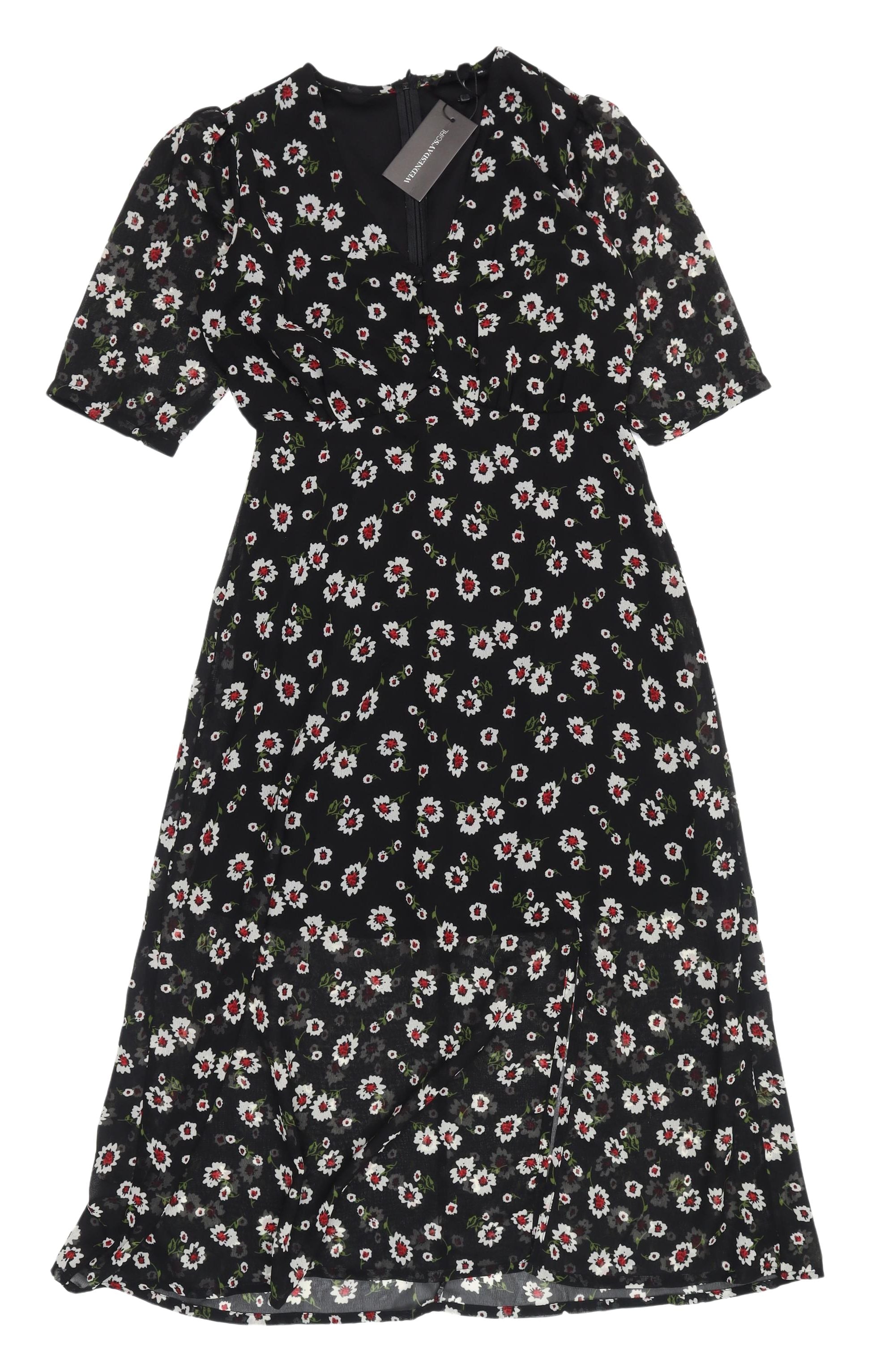 Enhance your wardrobe with this beautiful black floral A-line midi dress from Wednesday's Girl. Perfect for both casual outings and cocktail parties, this versatile dress is designed to make you stand out. Crafted from 100% polyester, it offers a light and airy feel, ideal for embracing spring and summer vibes. The vintage-inspired floral pattern adds a touch of retro charm, accentuated by its flattering 3/4 puff sleeves and elegant V-neckline. With a zip closure for easy wear and a pretty lined interior, this dress ensures you look stylish effortlessly. Whether you're heading to a garden party or a casual meet-up, this dress will be your go-to choice. Its machine washable fabric promises care-free maintenance. Grab this trendy piece now and enjoy the perfect blend of comfort and style.