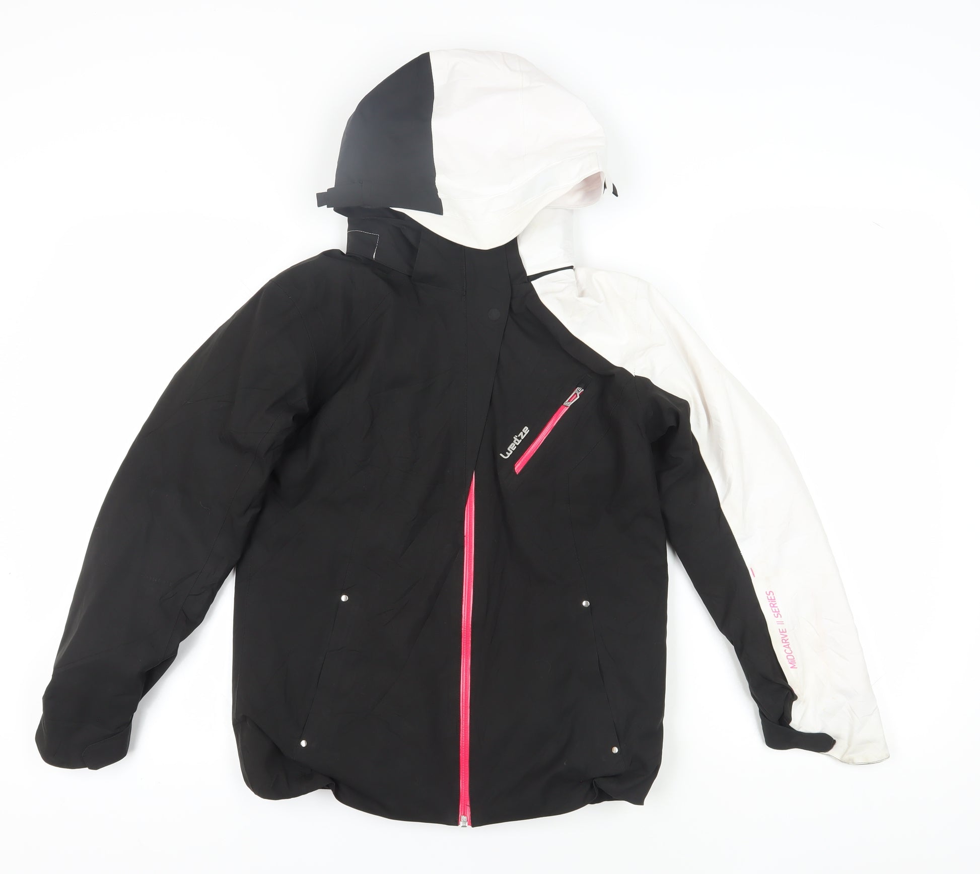 Prepare your young adventurer for the slopes with this stylish Wed'ze ski jacket, designed for girls who embrace the winter season. This mid-length jacket combines the versatile colours of black and white in a strikingly modern colourblock pattern, ensuring she stands out on the snow-covered hills. Crafted from durable polyester, the jacket promises to keep her warm and dry, thanks to its waterproof and insulated features. Safety and convenience are at the forefront with practical zipped pockets, a secure full zip closure, and a protective hood. This jacket is perfect for skiing, making it an ideal choice for both active days and casual outings. With its regular fit and machine washable fabric, it's easy to care for as well. Provide her with a blend of style and functionality with this excellent condition jacket, ensuring she remains comfortable and fashionable throughout the winter adventures.