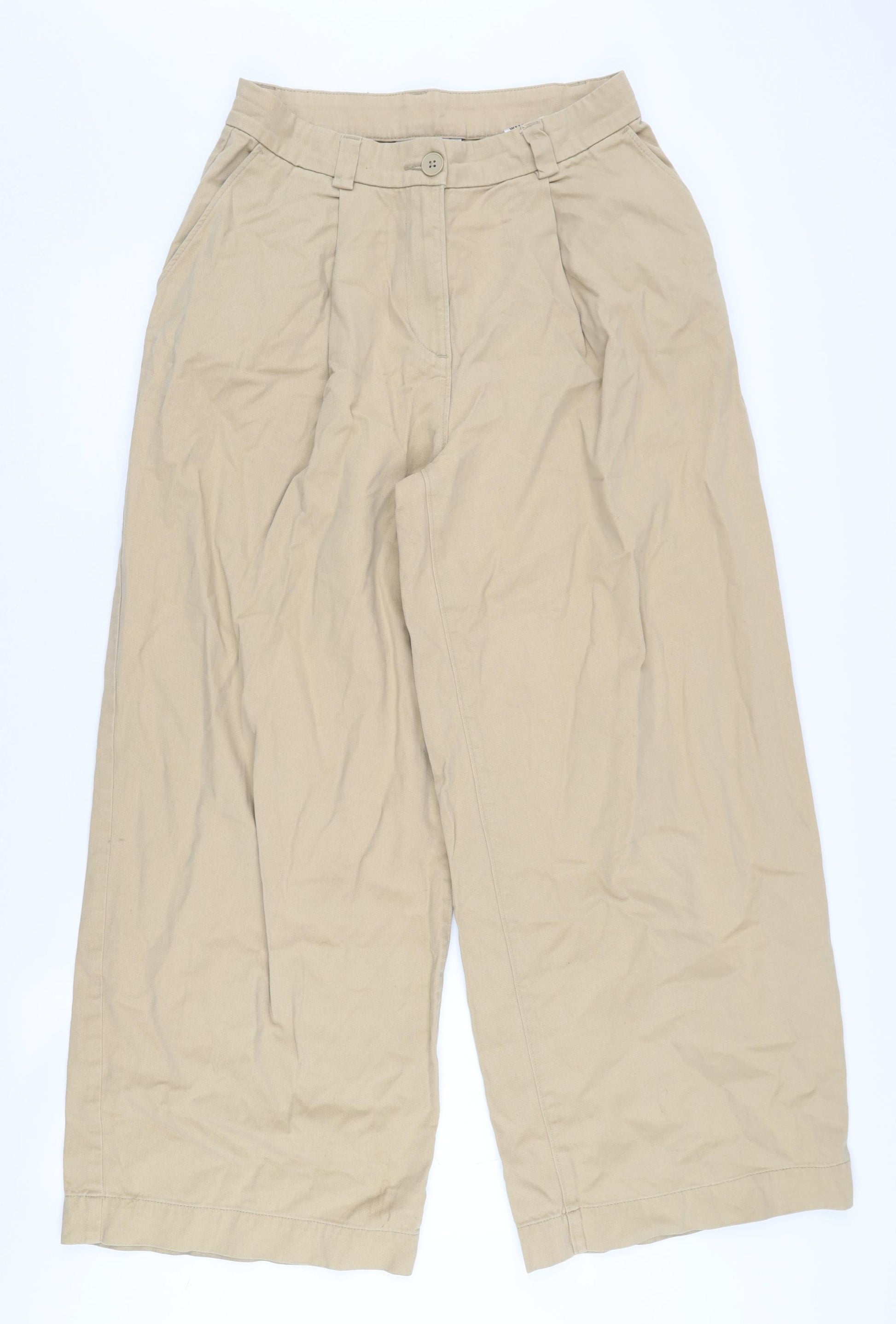 Elevate your wardrobe with these versatile Weekday women's chino trousers in a classic beige hue, perfect for both spring and autumn seasons. Designed with a high-rise fit, these trousers provide a relaxed, wide-leg silhouette that's sure to flatter your figure. Crafted from 100% cotton, they offer breathable comfort, making them ideal for casual occasions. The trousers feature a convenient button closure and practical pockets, ensuring both style and functionality. Their pleated front adds a touch of sophistication to the relaxed, yet polished design. Machine washable for easy care, these trousers are a staple piece you'll reach for time and again. Despite being in excellent condition, they show slight wrinkling, typical of a quality cotton garment, ensuring they maintain their chic appearance. The neutral beige colour makes them incredibly easy to pair with various tops and accessories, allowing you to create countless stylish outfits effortlessly. Whether you're heading to brunch or enjoying a casual day out, these Weekday chinos are a reliable choice for refined comfort and timeless appeal.