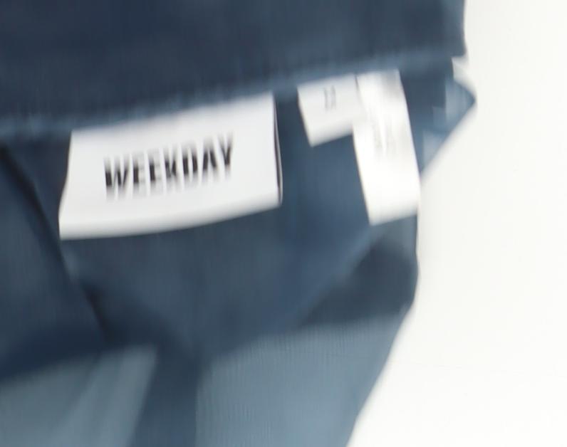 Experience effortless chic with this Weekday Women's Sheer Button-Up Shirt in blue, size 14. Perfect for the Spring and Summer months, this long-sleeve, collared top is crafted entirely from polyester mesh, creating a breezy and lightweight feel ideal for casual occasions. The regular fit makes it a versatile addition to any wardrobe, easily pairing with jeans or skirts for a relaxed yet stylish look. Though it sports a few minor snags, these do not detract from its overall appeal or functionality. Elevate your everyday style with this unique and comfortable piece. Machine washable for easy care.