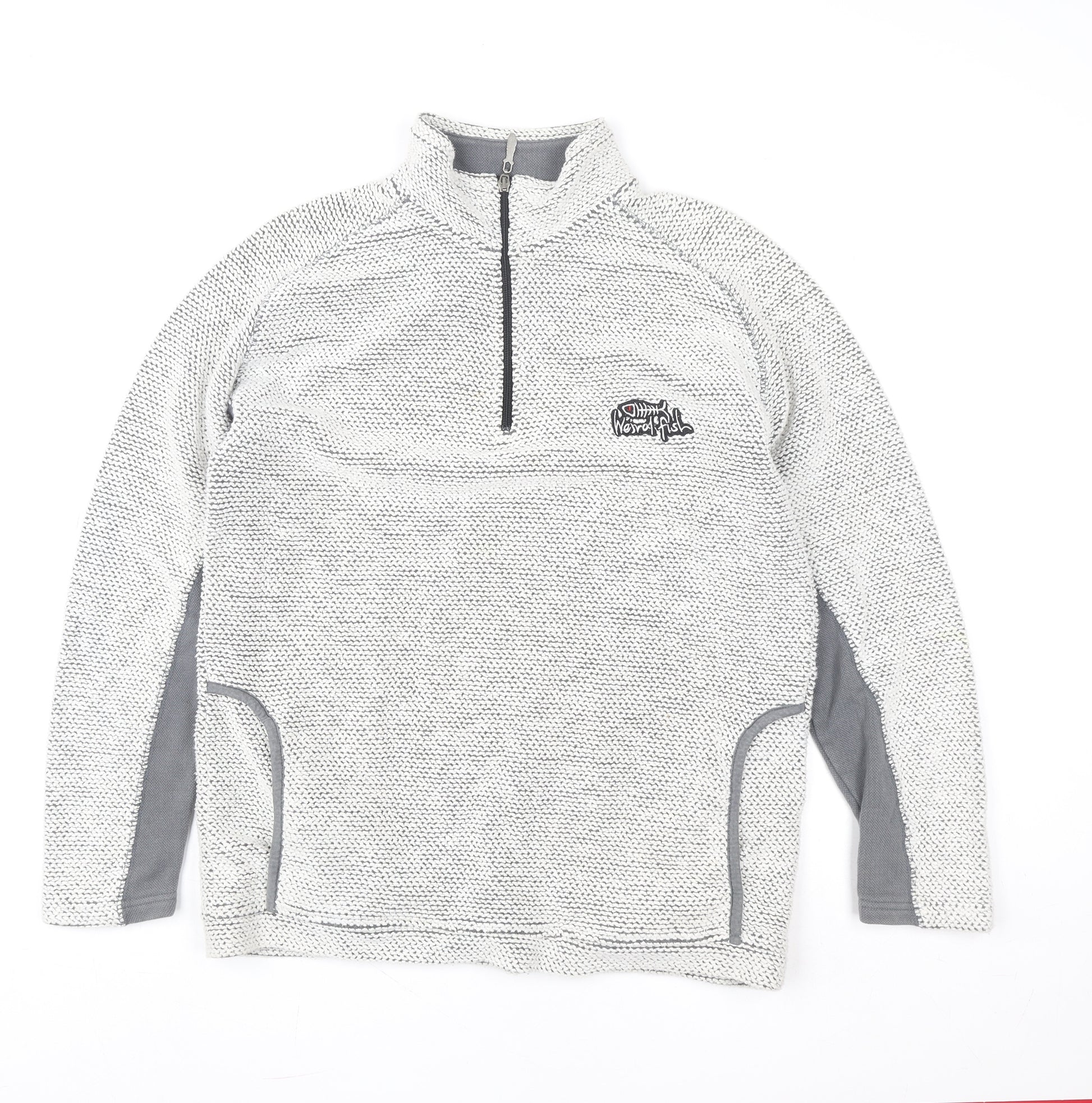 Stay comfortably stylish with this Weird Fish Men's Grey 1/4 Zip Knit Sweatshirt in size Small. Crafted from a high-quality blend of 90% Cotton and 10% Polyester, this sweatshirt offers a perfect balance of softness and breathability, ideal for all-season wear. The textured knit design provides a distinctive look, while the lightweight yet insulating fabric keeps you warm in cooler weather without feeling heavy. Designed with a mock neck and a practical quarter zip closure, it allows easy layering and adjustable ventilation. The sweatshirt features dual side pockets for casual functionality and a subtle logo accent at the chest that adds signature Weird Fish charm. Its relaxed regular fit and long sleeves make it suitable for daily wear or outdoor adventures such as walking, hiking, or travelling. The soft grey colour tones offer easy pairing with jeans, joggers, or chinos, creating a versatile casual staple for any wardrobe. In excellent pre-owned condition with minimal signs of use, it has been well cared for and remains fresh and clean. Machine washable and designed for comfort, this Weird Fish sweatshirt embodies a perfect blend of quality, durability, and effortless style. Whether worn for weekend outings, laid-back evenings, or light outdoor activity, this piece will keep you looking smart and feeling at ease throughout the seasons. A great addition for anyone seeking a dependable, classic piece of knitwear with functional design and the unique quirk of Weird Fish appeal, this is a fantastic buy for both comfort and versatility.