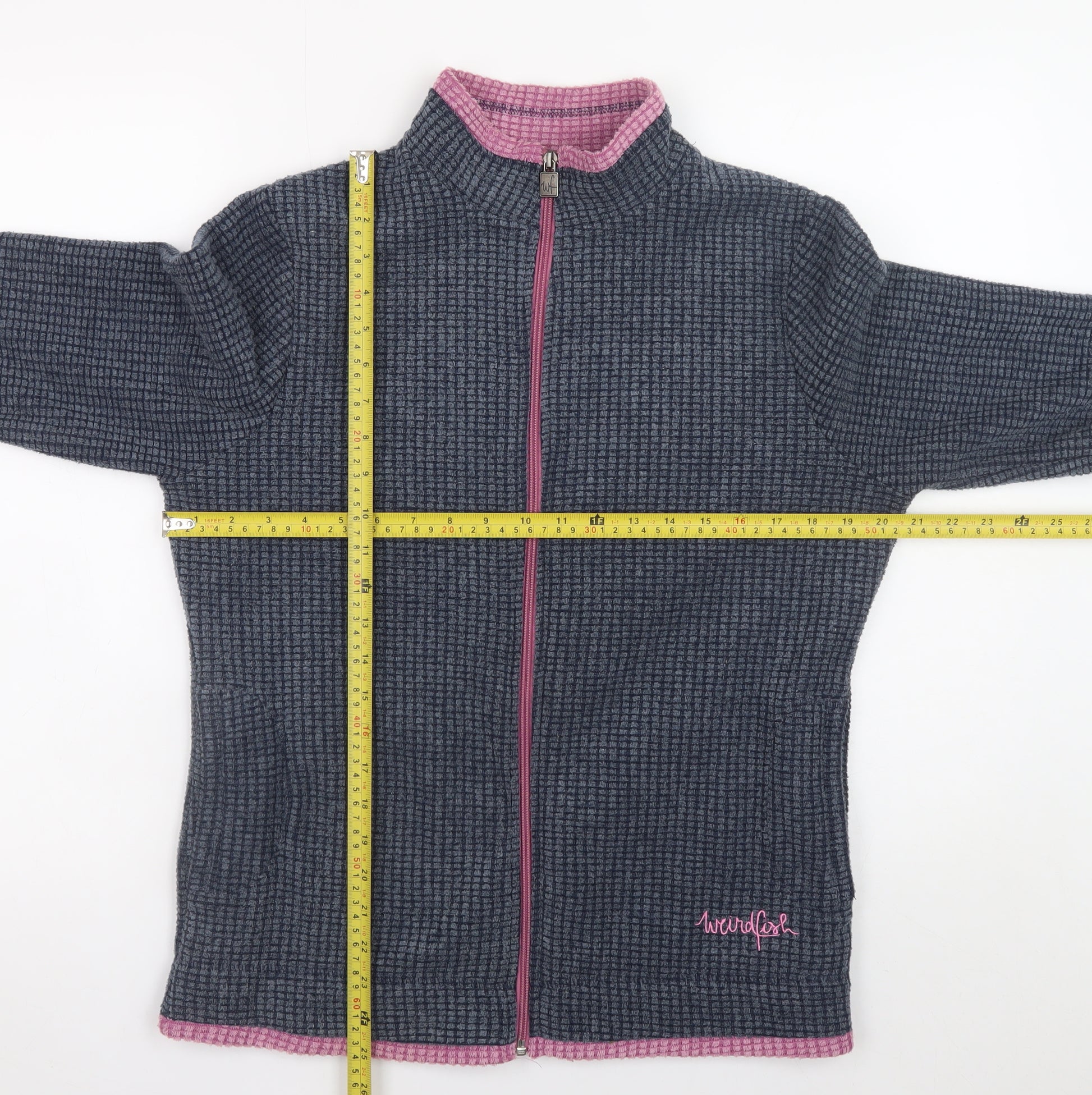 Stay cosy and stylish in this Weird Fish women’s blue jacket, designed for all-day comfort and easy wear. Crafted from a soft fleece-style fabric blend of 88% polyester and 12% viscose, it offers the perfect balance between warmth, breathability and lightweight everyday wear. The full front zip design makes it convenient to layer over your favourite tops or jumpers while the high neck collar provides extra coverage against chillier days. The interior is softly lined with a contrasting pink trim that adds a subtle pop of colour to the overall design, creating a relaxed yet feminine look. Ideal for casual outings, travel, weekend adventures, or simply running errands, this jacket embodies the laid-back, outdoor-loving spirit that Weird Fish clothing is known for. The distinctive Weird Fish logo embroidery on the front adds a touch of brand style without being overpowering. The mid-length cut and regular fit ensure comfort and freedom of movement, while two side pockets offer practical storage or a place to keep hands warm. This piece is machine washable for easy care, making it a dependable option for all seasons — particularly suited for autumn, spring, and light winter conditions. With no visible flaws and minimal signs of wear, the jacket remains in excellent pre-owned condition. A versatile wardrobe staple that’s both functional and easy to style, it’s perfect paired with jeans and boots for weekend walks or casual gatherings. Refresh your outerwear collection with this quality Weird Fish Women’s Jacket and enjoy its classic blue tone, soft texture, and enduring comfort — ideal for any lover of functional, relaxed and stylish clothing.