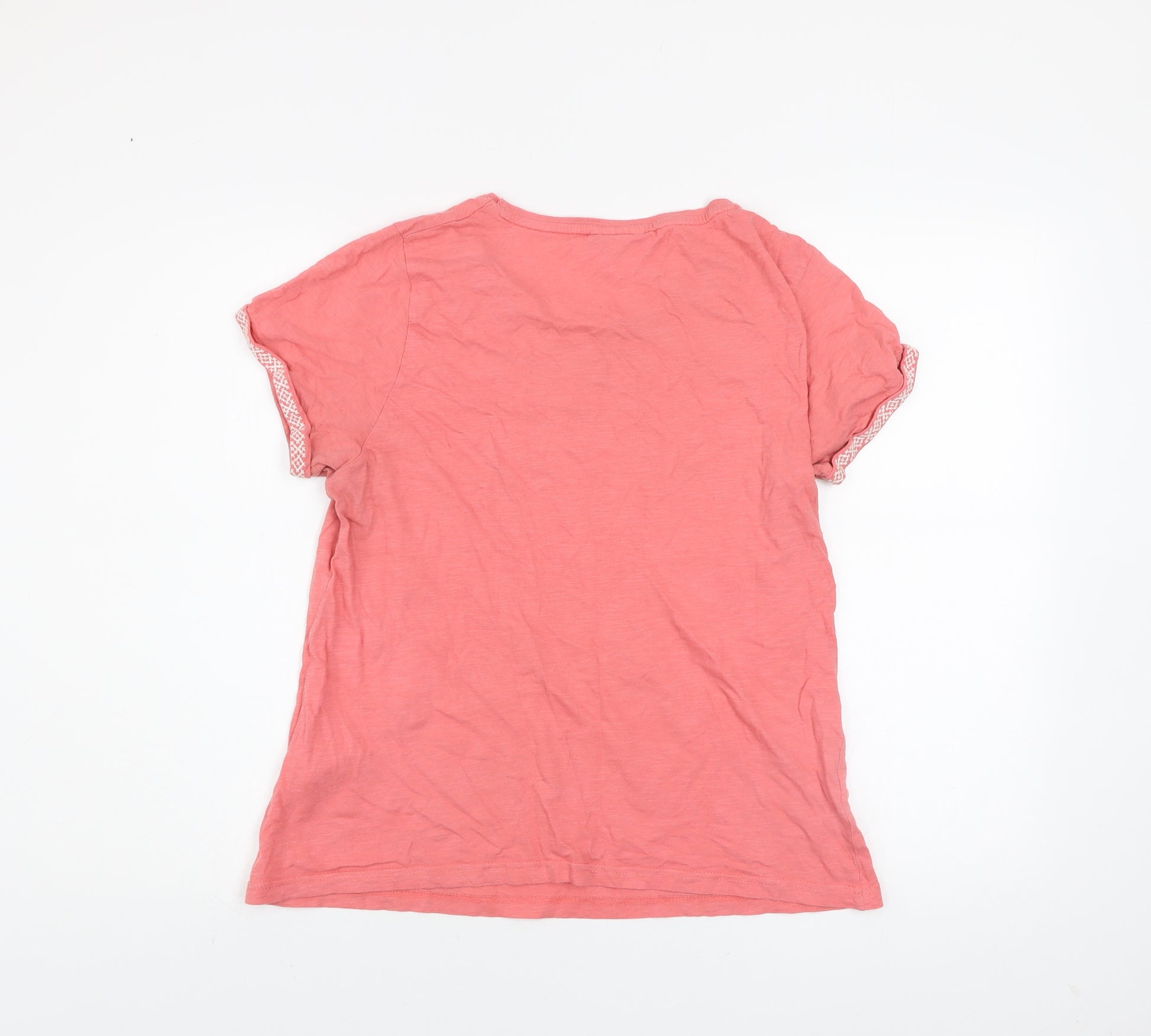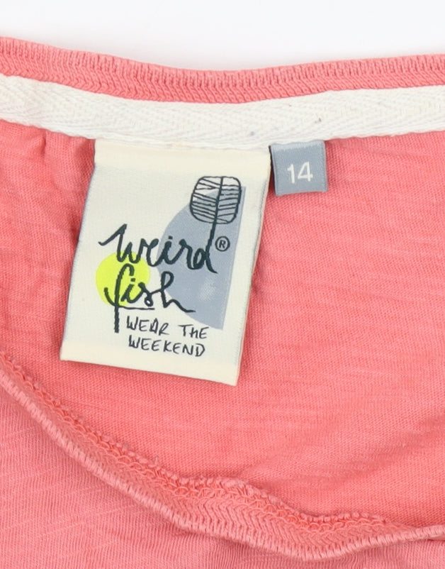 This Weird Fish Women’s Pink Organic Cotton T-Shirt in size 14 is perfect for your casual wardrobe and embodies the easygoing, laid-back charm the brand is known for. Crafted from 100% organic cotton in soft jersey fabric, it provides breathable comfort that feels fantastic against the skin. The lightweight construction and regular fit make it a versatile staple that pairs effortlessly with jeans, skirts or shorts for relaxed days out. Its solid pink colour offers a fresh, feminine look, while the charming embroidered Weird Fish branding near the hem adds a discreet design touch. The short cap sleeves subtly feature a tonal patterned trim to elevate the basic tee style, making it slightly distinctive while staying understated and wearable for every day. The crew neckline provides a classic, flattering shape that suits most body types. Perfect for spring and summer, the natural cotton material ensures a breathable and cool wear even in warmer temperatures. The pullover style allows easy dressing, while the relaxed, regular fit complements comfort-driven style seekers. Designed with practicality in mind, it’s machine washable and easy to maintain, making it a reliable go-to choice for casual outings, weekend walks, seaside trips, or lounging at home. In very good pre-loved condition, this top shows only light signs of wear and minor creasing consistent with gentle use. Functional yet fashionable, this T-shirt represents the relaxed outdoor spirit of Weird Fish—a brand celebrated for creating affordable, casual clothing designed for real life. A sustainable choice thanks to its 100% organic cotton composition, this T-shirt also makes an ideal gift for those who value comfort and eco-conscious materials. Add this simple yet stylish piece to your wardrobe and enjoy an everyday tee that combines quality craftsmanship, sustainability, and timeless comfort perfectly.