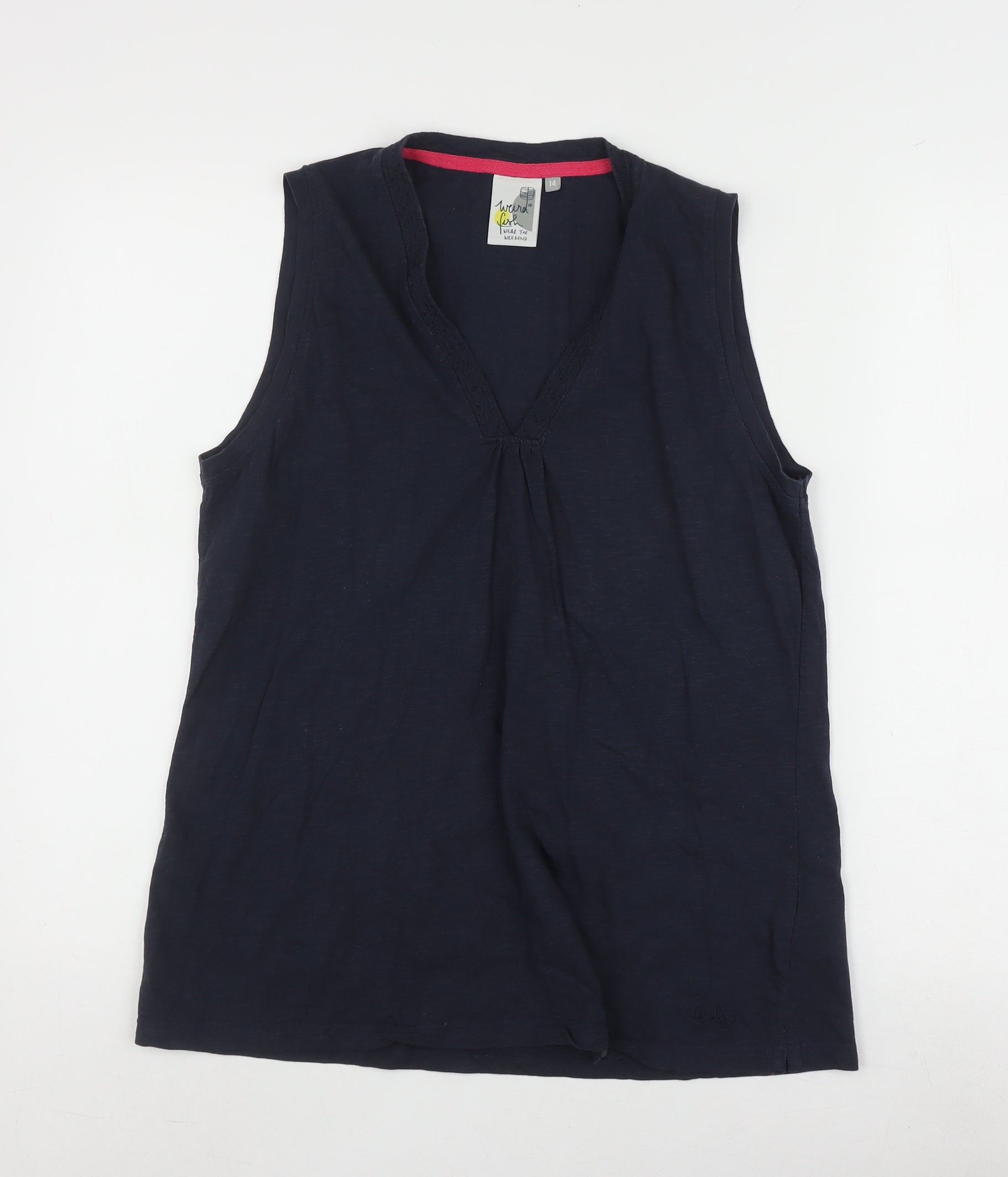 Elevate your casual wardrobe with this charming Weird Fish Women's Blue Tank Top. Crafted from 100% organic cotton, this top offers unbeatable comfort and breathability, perfect for warm weather or layering under your favourite jacket during cooler days. The solid navy hue provides a versatile foundation that can effortlessly complement various outfits, making it an invaluable addition to your collection.Designed with a stylish V-neck, this tank top flatteringly enhances your neckline while adding a touch of femininity. The sleeveless design ensures easy movement, allowing you to stay active and comfortable throughout the day. Perfect for casual occasions, this piece is ideal for a relaxed day out, a casual get-together, or even a laid-back office look when paired with a blazer.Thanks to its jersey knit fabric, this top boasts a soft, comfortable feel against your skin. Its breathable and lightweight nature makes it an easy choice for spring and summer, while also being suitable for layering in other seasons. As a regular size 14, it offers a flattering fit that is not too snug or too loose, providing just the right balance of comfort and style.Overall, this Weird Fish tank top is an excellent choice for those seeking a versatile and comfortable piece with a touch of casual elegance. Now available at a competitive price, it’s time to enhance your everyday wardrobe with this beautiful and functional garment.