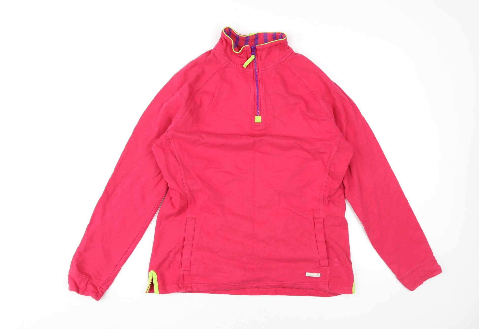 Add a pop of vibrant pink to your wardrobe with this stylish Weird Fish Women's Sweatshirt. Crafted from 100% soft and breathable cotton, this pullover is designed for ultimate comfort and durability. The lightweight jersey fabric makes it an ideal choice for transitional seasons like autumn and spring. The high neckline with a convenient 1/4 zip closure ensures a cosy fit, while the raglan sleeves add a touch of modern flair. Perfect for casual outings or relaxed weekends, this sweatshirt is versatile and chic. With its regular fit, this size 14 piece features functional pockets, allowing you to carry essentials with ease. Whether paired with jeans or leggings, this sweatshirt enhances your casual ensemble effortlessly. Enjoy machine-washable convenience, maintaining its excellent condition with ease. Choose the Weird Fish Women's Pink Sweatshirt for a blend of comfort and style, making it a must-have piece for any casual wardrobe collection.