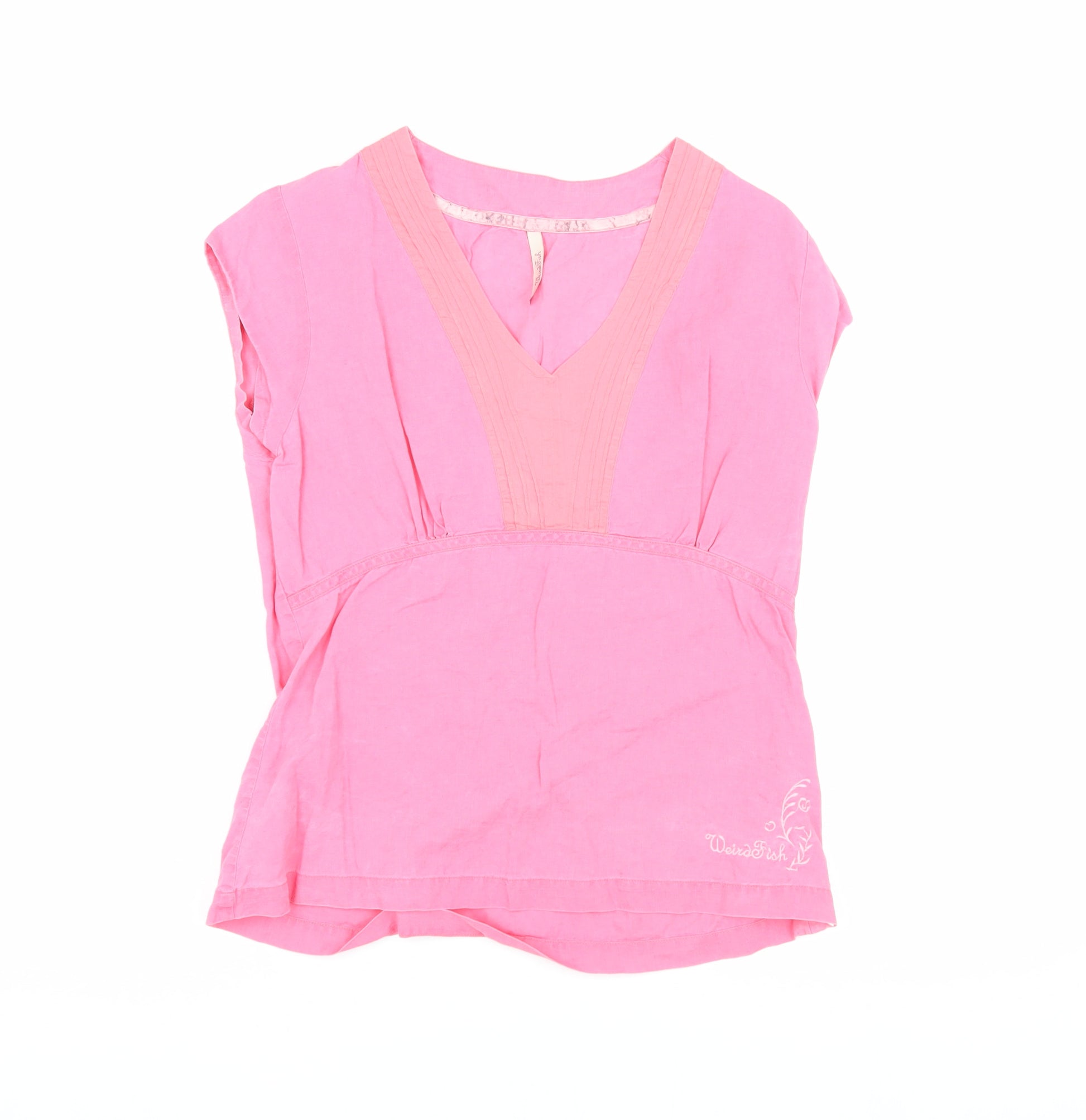 Brighten up your wardrobe with this delightful pink blouse from Weird Fish, a perfect blend of style and comfort. Cut in a flattering medium size, it features a cool V-neck design that adds a touch of elegance, making it suitable for both casual outings and relaxed gatherings. The charming cap sleeves and the solid pink colour enhance its feminine appeal, while the subtle embroidered accents provide a unique detail that sets it apart from your standard tops. Crafted from a luxurious mix of 55% linen and 45% cotton, this blouse promises breathability and softness, ideal for keeping you comfortable throughout the day. Its sleeveless construction is excellent for layering or wearing as is on warmer days. This top is also machine washable, ensuring that care for it is as simple as its styling. With its regular fit, this blouse drapes beautifully on the figure, and the solid pattern offers versatile styling options, allowing you to pair it with jeans, skirts, or shorts. Though gently worn, it remains in excellent condition with no visible signs of wear, ready to be your next favourite piece. Whether dressing up for a brunch or keeping it low-key for a casual night out, this Weird Fish blouse is an essential addition to your wardrobe.