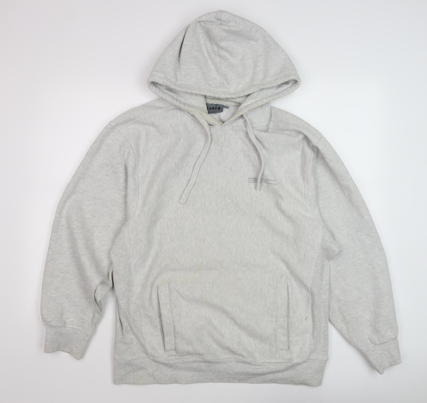 Upgrade your casual wear with this versatile WESTBEACH pullover hoodie, crafted to provide utmost comfort and style for every season. Made from an organic cotton and polyester blend, this grey hoodie ensures breathability and softness, making it ideal for all-day wear. With a classic crew neck design and long sleeves, it lends a relaxed and laid-back vibe, perfect for casual outings or lounging at home. Featuring a drawstring closure for an adjustable fit, and a hood to keep you warm during chilly days, this hoodie becomes a staple in any wardrobe. The kangaroo pockets add practicality and convenience, keeping your hands toasty or securely holding your essentials. Although in very good condition, there is slight discolouration near the pocket, which doesn’t detract from the appeal or functionality of the piece. Whether you're heading out for a brisk walk or meeting up with friends, this fleece hoodie blends comfort and practicality with effortless style. Don't miss the opportunity to incorporate this essential piece into your collection, ensuring you stay cosy and fashionable throughout the year. WESTBEACH brings you quality and design, making this hoodie a must-have investment for your wardrobe.