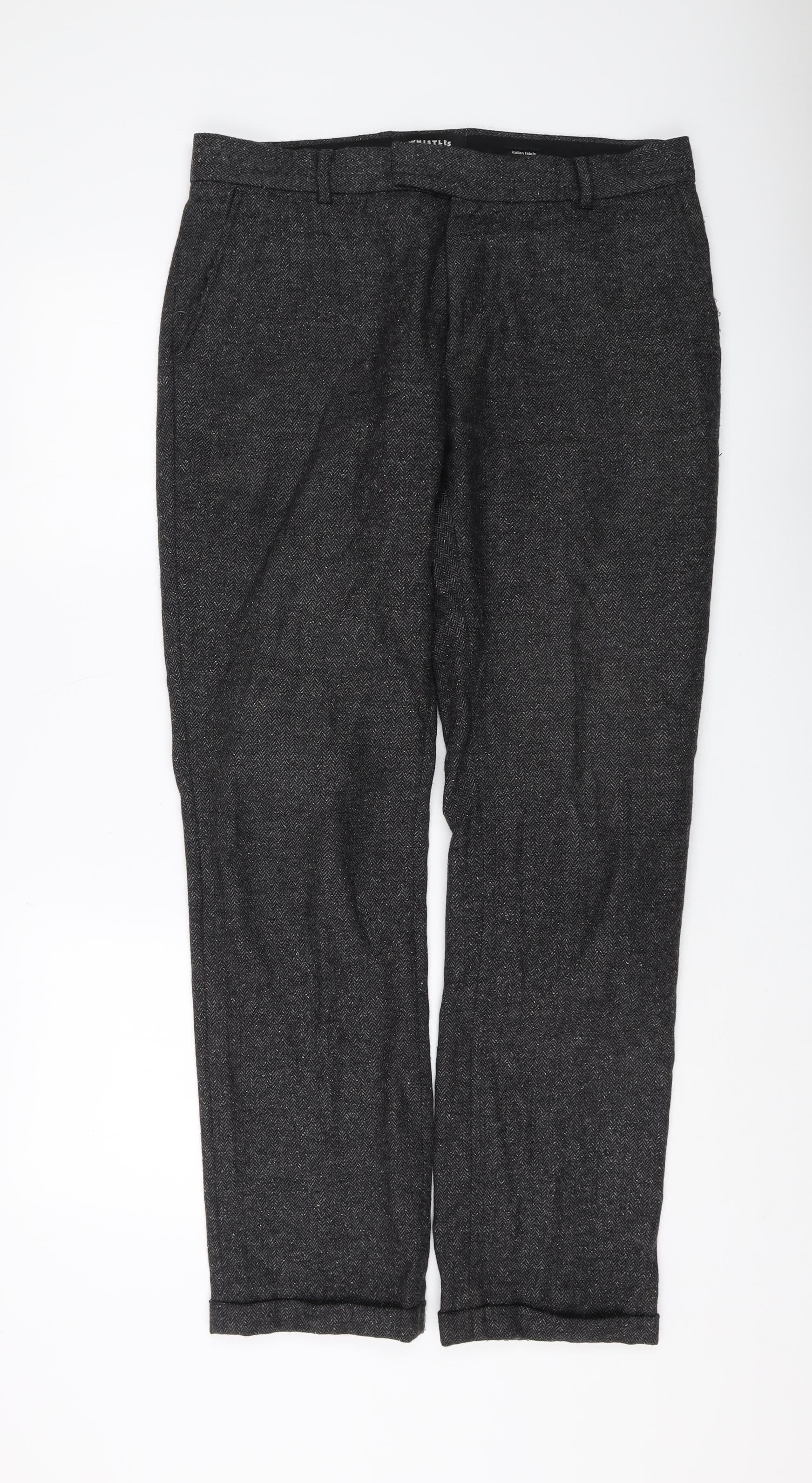 Explore sophisticated style with these Whistles men's trousers in a refined grey herringbone pattern. Crafted from a luxurious blend of materials including wool, nylon, and silk, these trousers offer both warmth and a touch of elegance. The additional materials of acrylic, polyester, and viscose contribute to the trousers' durability and comfort, ensuring they maintain their shape while keeping you comfortable throughout the day. Perfect for formal or business occasions, the refined design and high-quality fabrics elevate any ensemble. With their excellent condition and modern craftsmanship, these trousers promise to be a versatile addition to your wardrobe that you can rely on season after season.