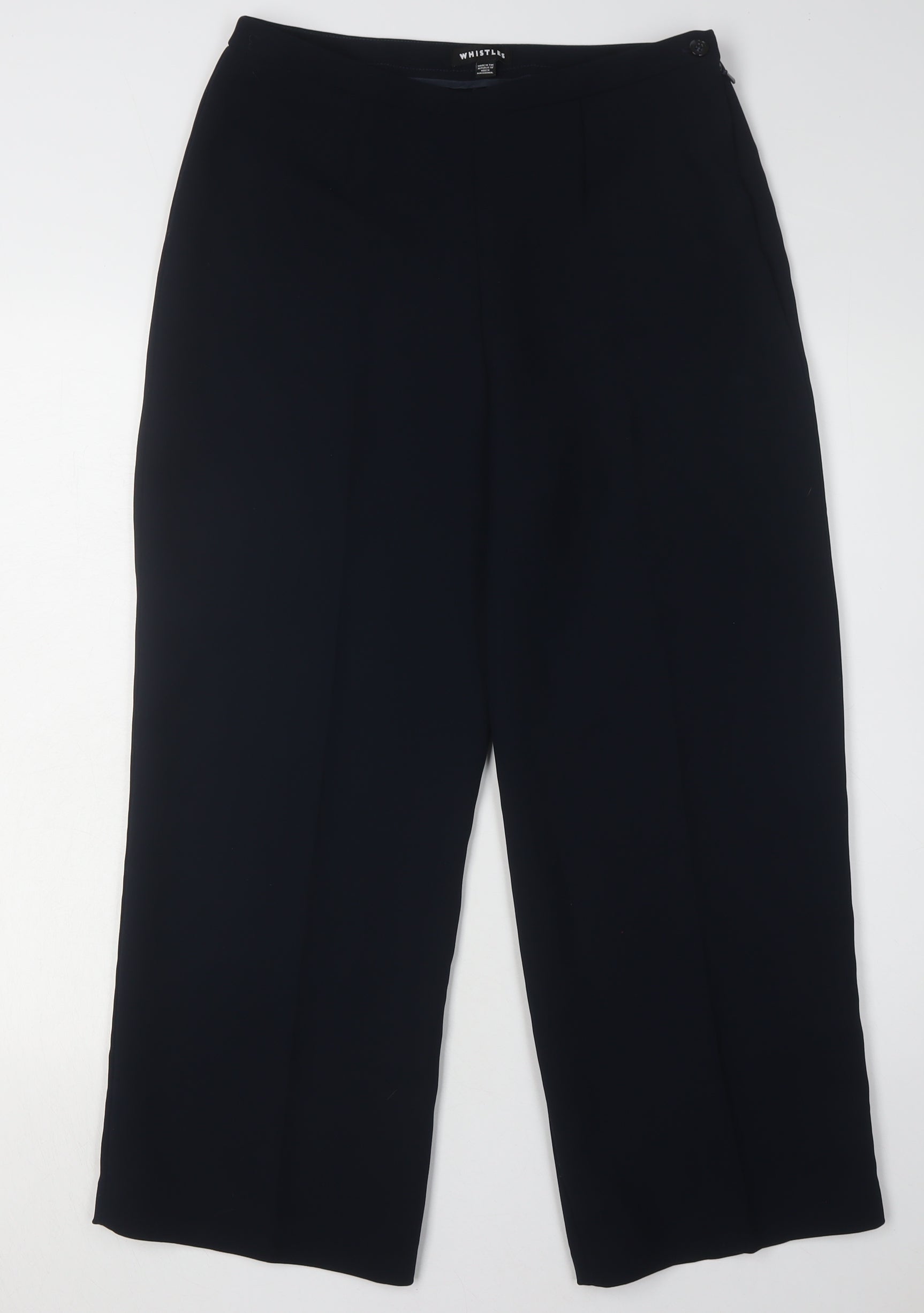 Elevate your wardrobe with these elegant Whistles women's trousers in a versatile black shade, perfect for various occasions. Ideally suited for the modern woman, these trousers come in a comfortable size 12 with a flat front design, effortlessly blending style and comfort. Made entirely of polyester, they promise durability and a soft feel, ensuring you stay both stylish and comfortable throughout your day. Designed for the regular size type, these trousers are easy to maintain, being machine washable, making them a hassle-free addition to any wardrobe. The timeless black colour offers a sleek and sophisticated aesthetic that pairs seamlessly with a variety of tops and shoes. Whether dressing up for a formal event or keeping it casual, their no-pattern design ensures they remain a versatile staple piece. Although the trousers do not include visible tags, they present themselves in excellent condition, without any noticeable imperfections, offering quality akin to new. Priced affordably, they represent a fantastic opportunity to add a touch of refined elegance to your collection. Explore the versatility of these Whistles trousers and enjoy a staple that complements and enhances your style effortlessly.