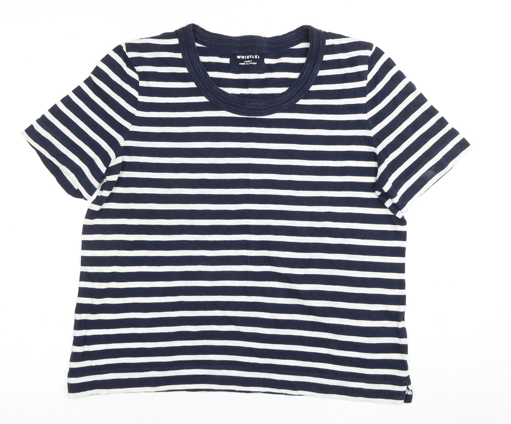 Elevate your casual wardrobe with this classic Whistles Women's Striped T-Shirt. Crafted from 100% cotton, this breathable and lightweight top ensures utmost comfort for everyday wear. The rich blue and white stripes add a touch of nautical elegance, making it a versatile piece for any season. With a timeless crew neck and regular fit, it easily pairs with your favourite jeans or shorts for a laid-back, stylish look. Ideal for women who appreciate quality and style in their everyday attire, this Whistles T-shirt is your go-to choice for a classic yet chic appearance. Perfect for casual outings or relaxed weekends, enjoy the effortless charm and comfort this top brings to your collection.