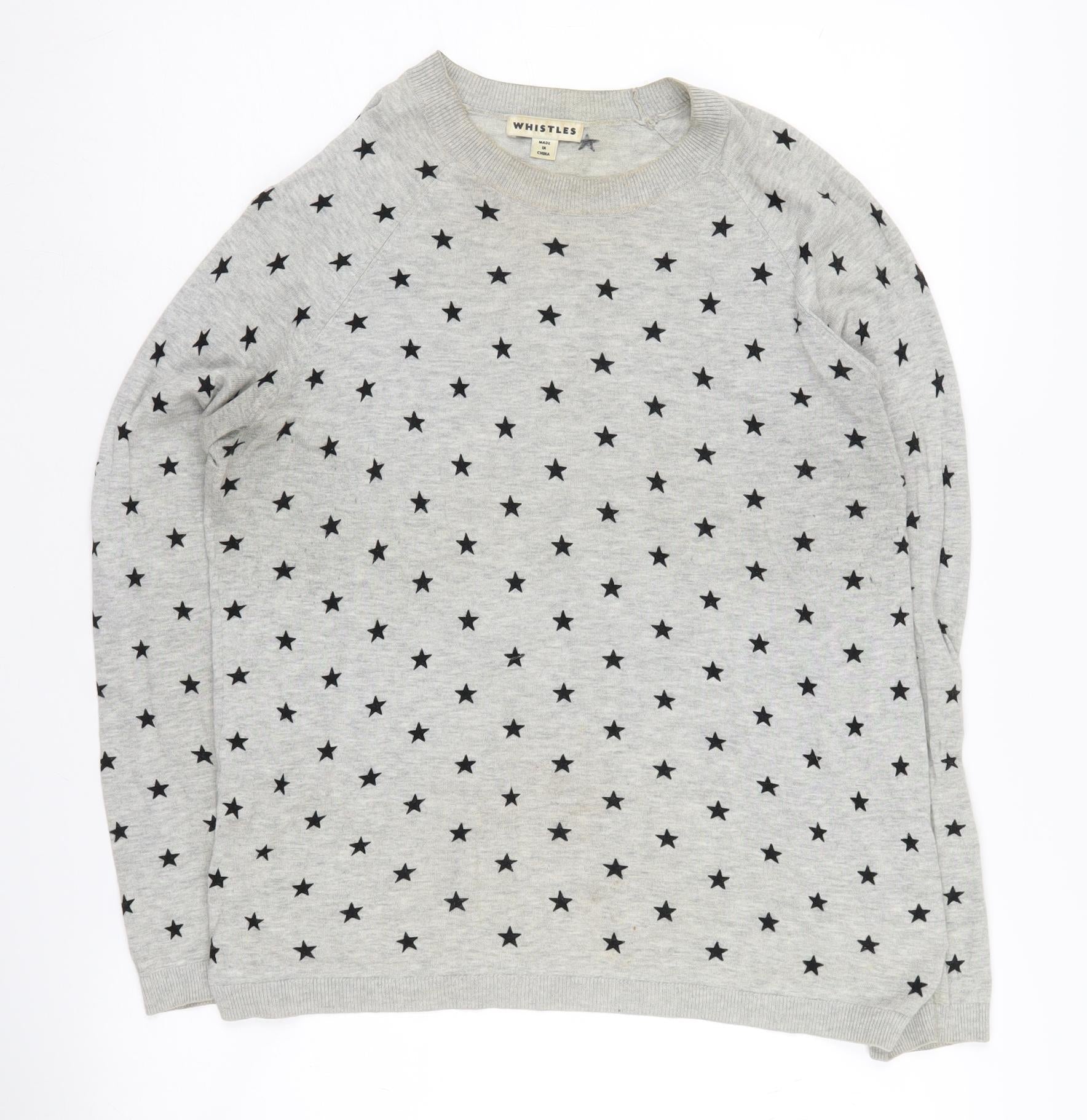Elevate your wardrobe with this stylish Whistles Women's Pullover Jumper in a chic grey shade adorned with a classic star pattern. Crafted from 100% cotton, this jumper ensures a comfortable fit perfect for all-day wear. Its timeless round neckline and regular fit make it versatile for myriad occasions, from casual outings to relaxed office wear. Its long sleeves offer additional warmth ideal for transitional seasons. Although pre-owned, this piece remains in excellent condition with only minor signs of wear and no visible tags, ensuring you receive quality without compromising on style. Perfect for those who appreciate understated elegance with a touch of whimsy. Hand wash only to keep its splendid looks intact. Embrace both comfort and style in this must-have addition to your wardrobe.