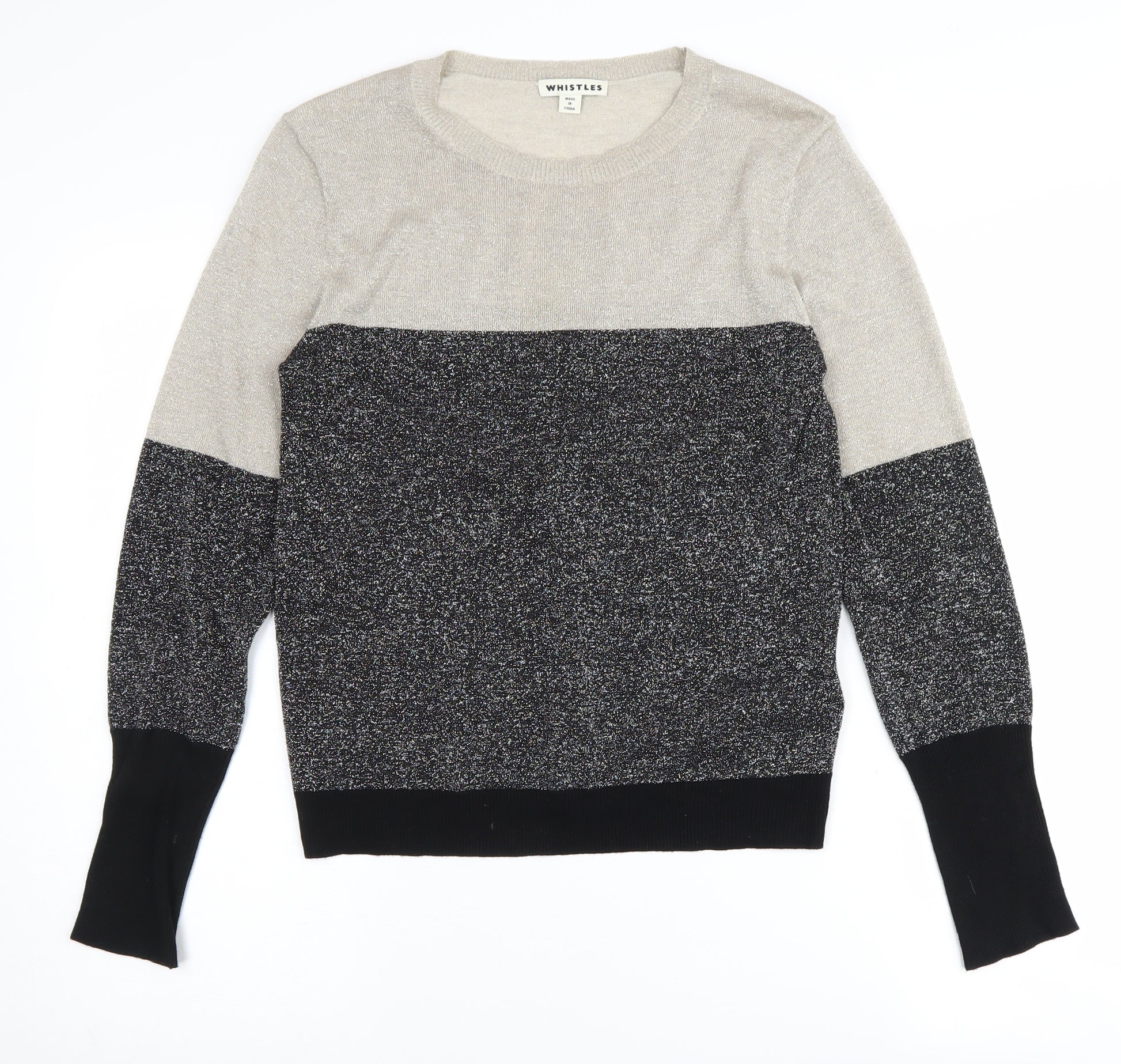 Elevate your winter wardrobe with this Whistles Women's Multicoloured Jumper. Designed in a regular fit, this stylish piece combines shades of black with a luxurious ribbed texture, perfect for casual occasions. Crafted from a blend of viscose and polyester with metallic fibres, it offers both comfort and a subtle sparkle, making it a versatile choice for day or night. The crew neckline and long sleeves add a classic touch, while the knit fabric ensures warmth and softness. Pair it with your favourite jeans or a chic skirt for an effortless look. Despite slight signs of wear, this jumper remains in excellent condition, ready to become a staple in your collection. Suitable for autumn and winter, it's an ideal piece for those who appreciate both fashion and function. Add this to your ensemble for a sophisticated and stylish silhouette.