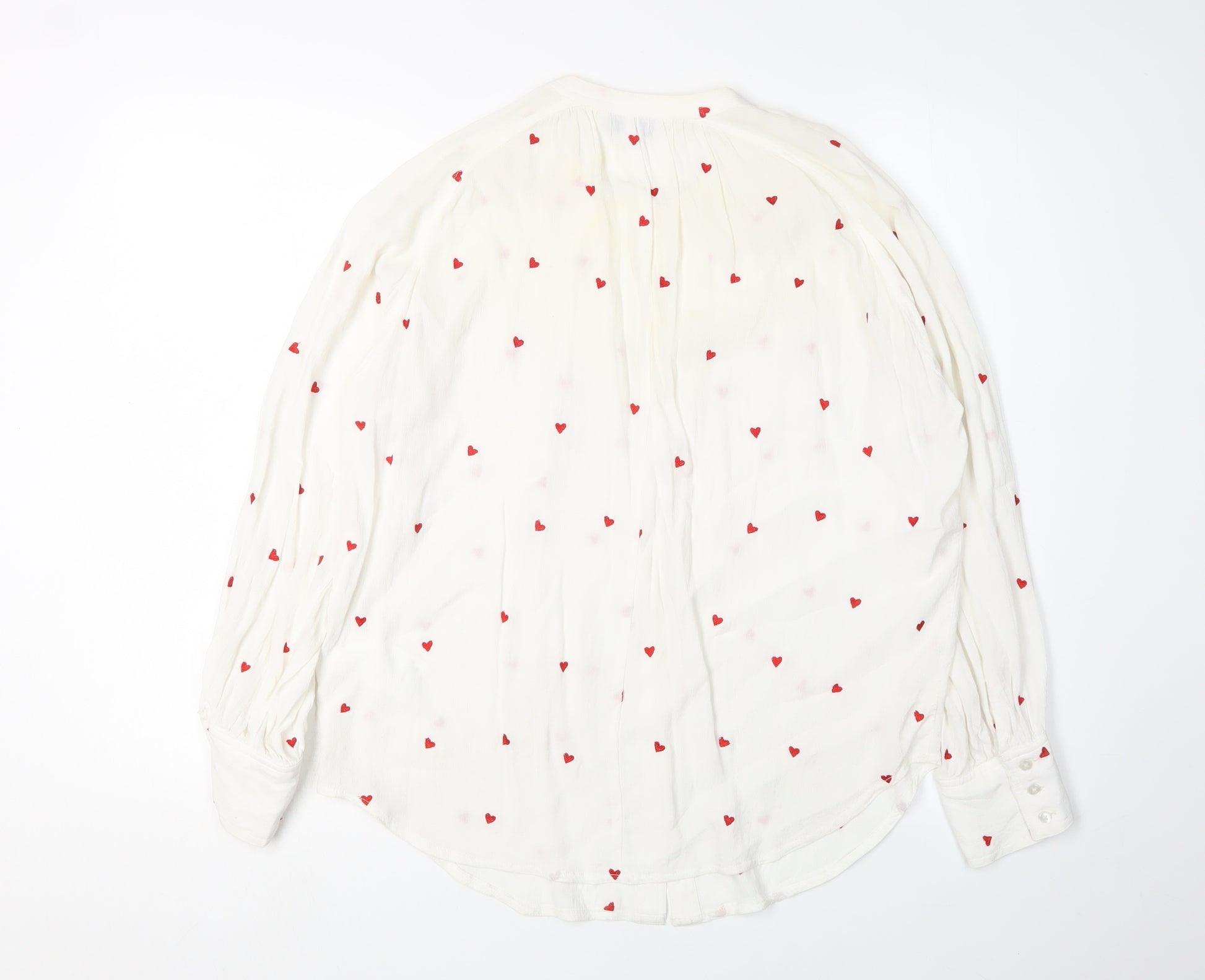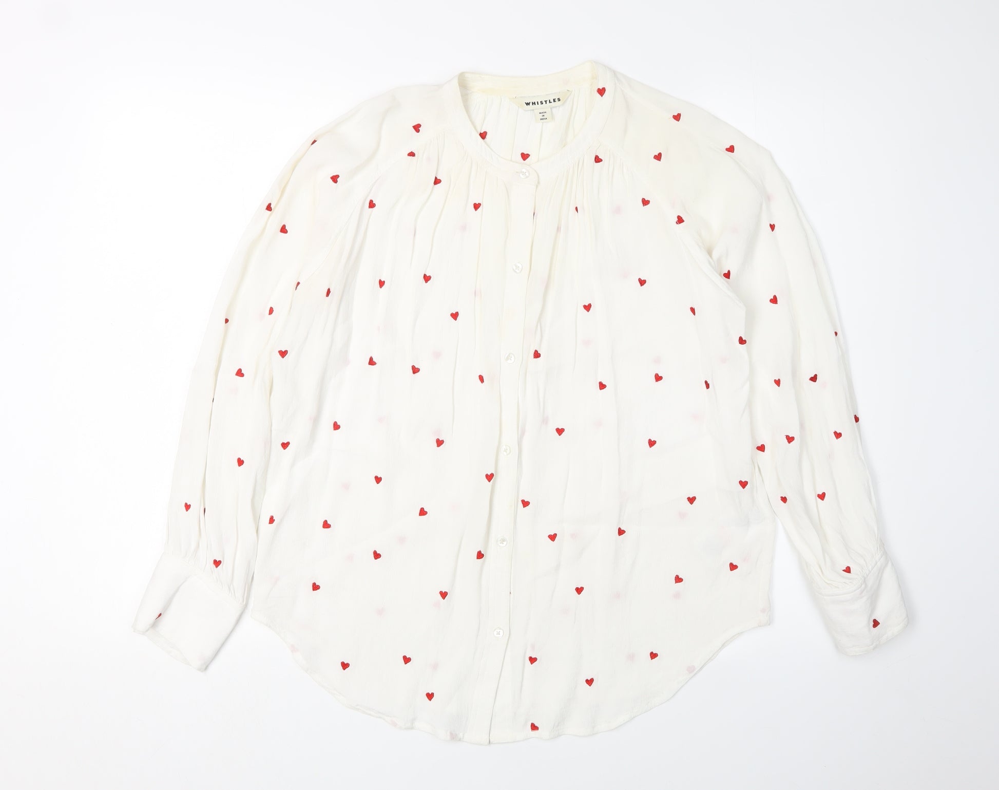 Add a touch of elegance to your wardrobe with this beautiful Whistles blouse. Designed in a flattering tunic style, this top is perfect for both casual and semi-formal occasions. The blouse features a delicate embroidered red heart pattern set on a soft white backdrop, ensuring you stand out with sophistication. Crafted from breathable 100% viscose, it provides comfort and style suitable for spring and summer days. The long sleeves and raglan design give an effortless flow, while the button closure offers ease of wear. This versatile piece can be paired perfectly with jeans or a skirt, reflecting both class and comfort. Size UK 10 offers a regular fit for a chic look. Note a subtle wear indicative of gently preloved condition. A perfect addition to lift your wardrobe essentials and showcase your fashion-forward choice.