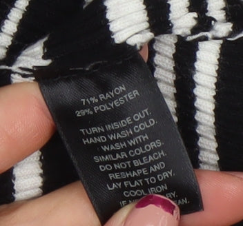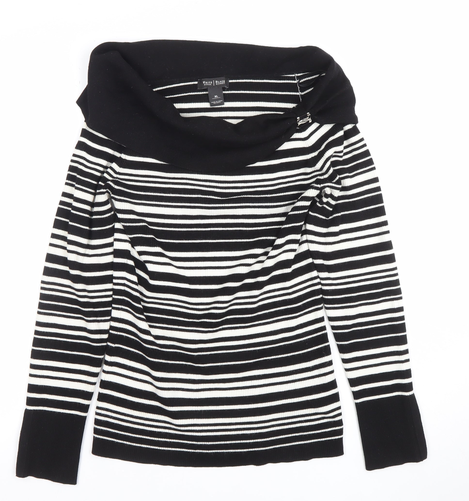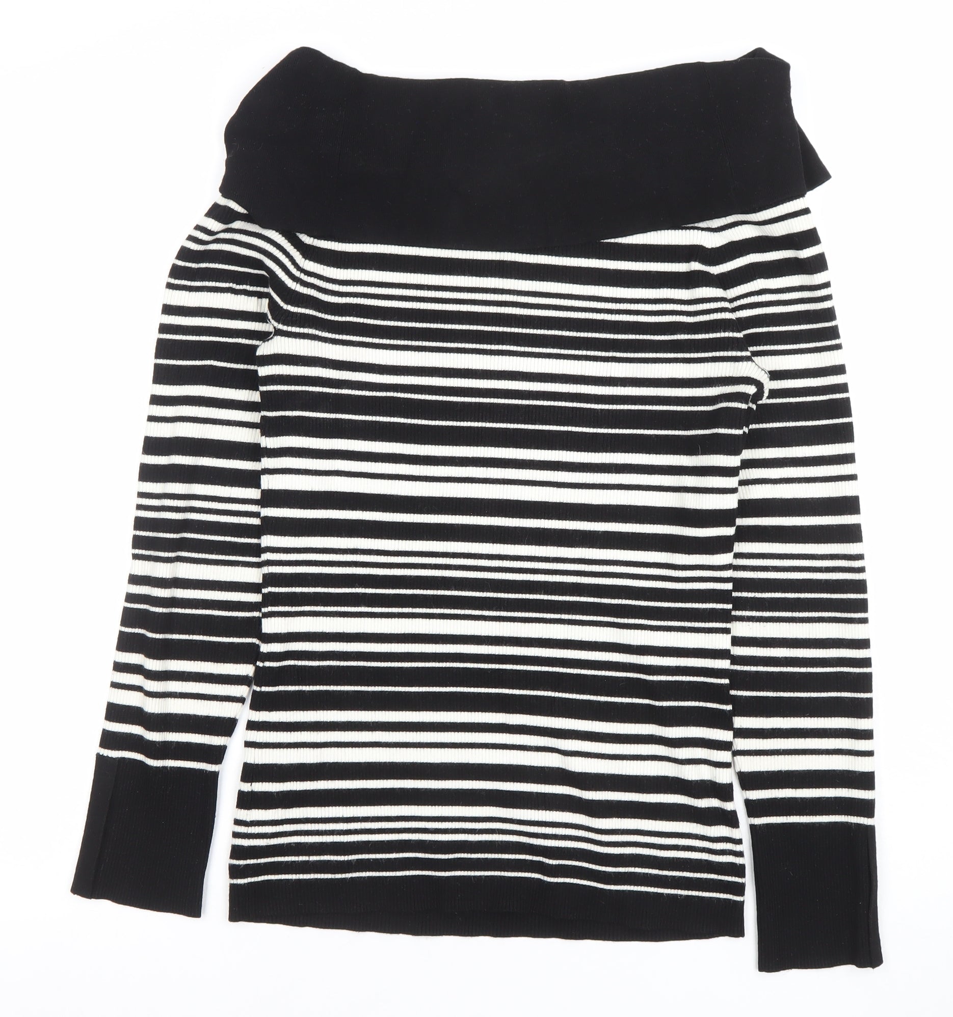 Elevate your casual wardrobe with this chic and versatile off-the-shoulder top from White House Black Market. Designed in a contemporary black and white striped pattern, this long sleeve knit blouse offers both style and comfort for all seasons. Crafted from a soft and stretchy blend of rayon and polyester, the fabric has a smooth, lightweight feel that drapes beautifully and keeps its shape wear after wear.The off-the-shoulder neckline brings an elegant, feminine edge to your outfit, perfect for day-to-evening transitions. The classic fit and ribbed knit design complement the silhouette while allowing flexibility and ease of movement. Ideal for pairing with tailored trousers, jeans, or skirts, this top works effortlessly for both casual days and dressier occasions.The long sleeves and thicker knit texture make it especially suitable for cooler autumn and winter months, while the neutral colour palette ensures it pairs seamlessly with a variety of layers and accessories. Designed in a timeless black and white contrast, it captures the brand’s signature modern monochrome aesthetic.Garment care is simple, with hand wash instructions to maintain the soft texture and shape of the knit. This piece is preloved but in excellent condition with no visible flaws, ensuring you’ll receive a quality, well-maintained garment ready to wear.Whether you’re dressing for a weekend coffee catch-up, a relaxed office look, or an evening out, this White House Black Market top adds a sleek and stylish touch to your wardrobe. Its flattering neckline, versatile design, and superior quality materials make it a must-have staple piece that combines sophistication with comfort.A wardrobe classic with enduring appeal, this women’s off-the-shoulder striped top offers the perfect balance of effortless elegance and relaxed glamour—ideal for any fashion-forward woman looking to enhance her collection with a timeless and flattering sweater-style blouse.