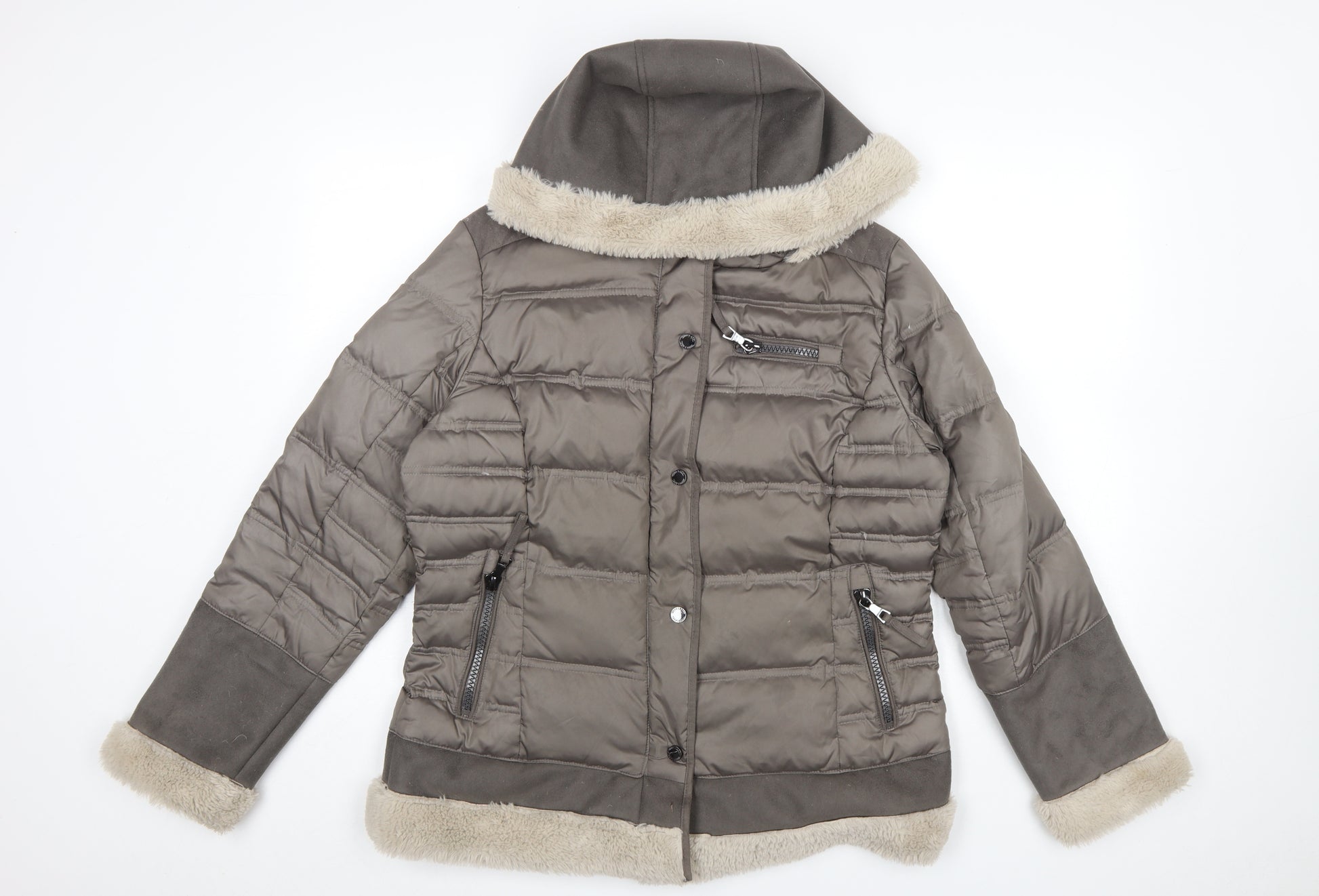 Women's Brown Size 14 Hooded Puffer Jacket with Fur Trim
