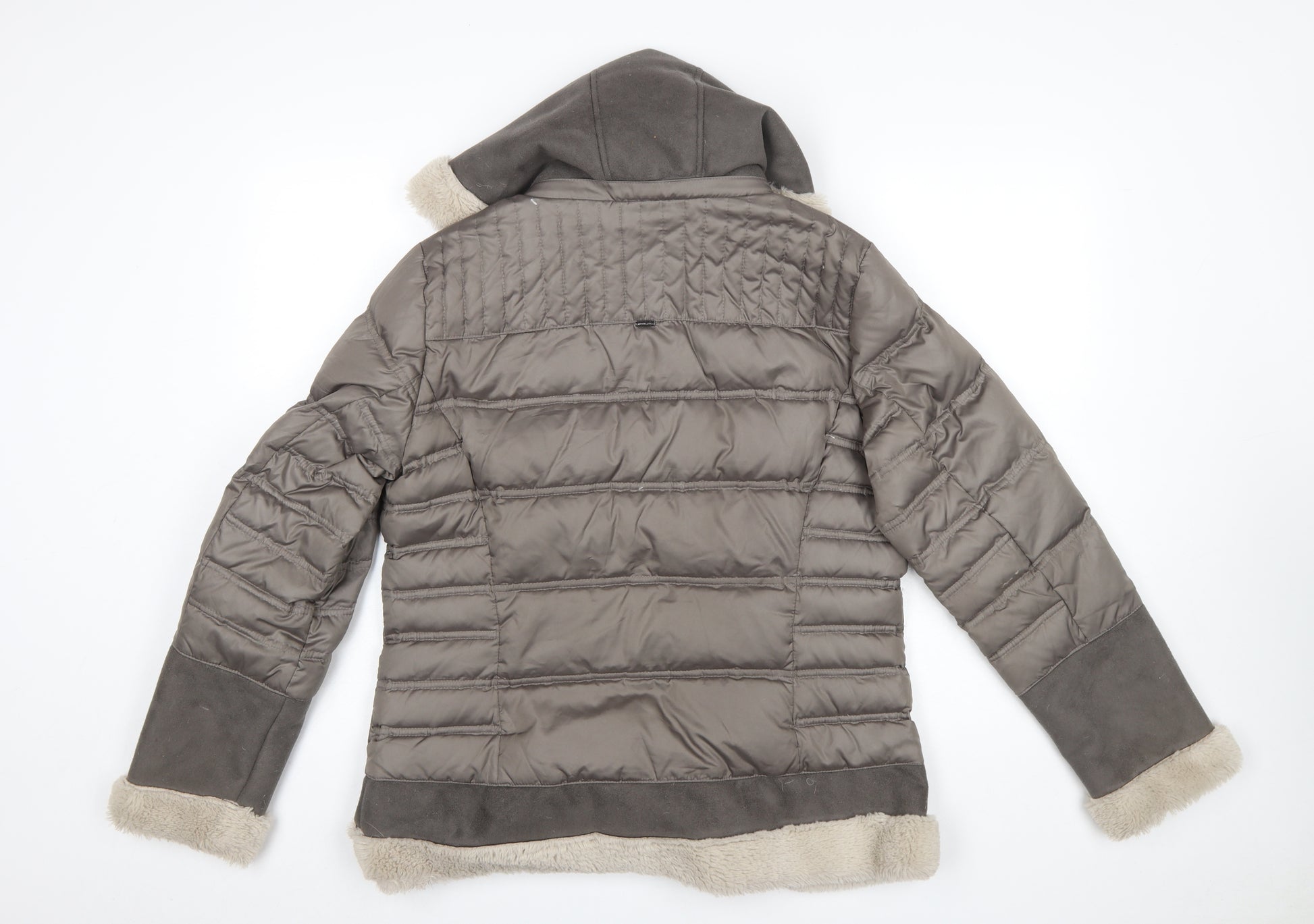 This White Label women's puffer jacket by ROFA Fashion Group combines warmth, practicality, and timeless design. Crafted from durable 100% polyester, the piece features a quilted exterior with plush faux fur trim, adding both a luxurious finish and extra comfort around the collar and cuffs. Designed in a warm brown shade, it’s a versatile choice that complements a wide range of seasonal outfits.The jacket is fully lined and padded for cosiness, making it ideal for cold weather wear. The hood provides increased protection against the elements, while the zip and button front fastening ensure extra insulation. Functional details include several front zipped pockets—perfect for storing small essentials securely—and quilted panel stitching that provides a flattering shape without being restrictive. The mid-length cut ensures good coverage and warmth without sacrificing mobility.With its soft microfibre fabric and carefully thought-out design, this jacket embodies comfort and utility, making it perfect for both everyday errands and travel during the cooler months. The neutral brown tone ensures it pairs easily with denim, knitwear, or boots for a classic winter look. Designed for women who value both practicality and style, this mid-length puffer is also machine washable for hassle-free care.In excellent pre-loved condition, this White Label coat shows minimal signs of wear and retains its original structure and padded fill. Offering quality craftsmanship typical of ROFA’s outerwear line, this jacket is a reliable cold-weather staple that feels as good as it looks—ideal for women seeking an elegant yet functional winter layer ready to accompany any casual or outdoor outfit.
